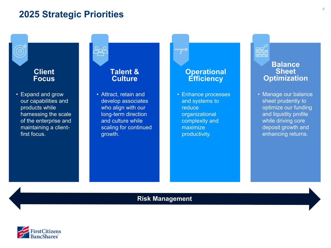 62025年战略优先事项•扩大和发展我们的能力和产品,同时利用企业规模并保持客户至上的重点。以客户为焦点•吸引、留住和发展符合我们长期方向和文化的员工,同时扩大规模以实现持续增长。人才与文化•增强流程和系统,以降低组织复杂性并最大限度地提高生产力。运营效率•审慎管理我们的资产负债表,以优化我们的资金和流动性状况,同时推动核心存款增长和提高回报。资产负债表优化风险管理