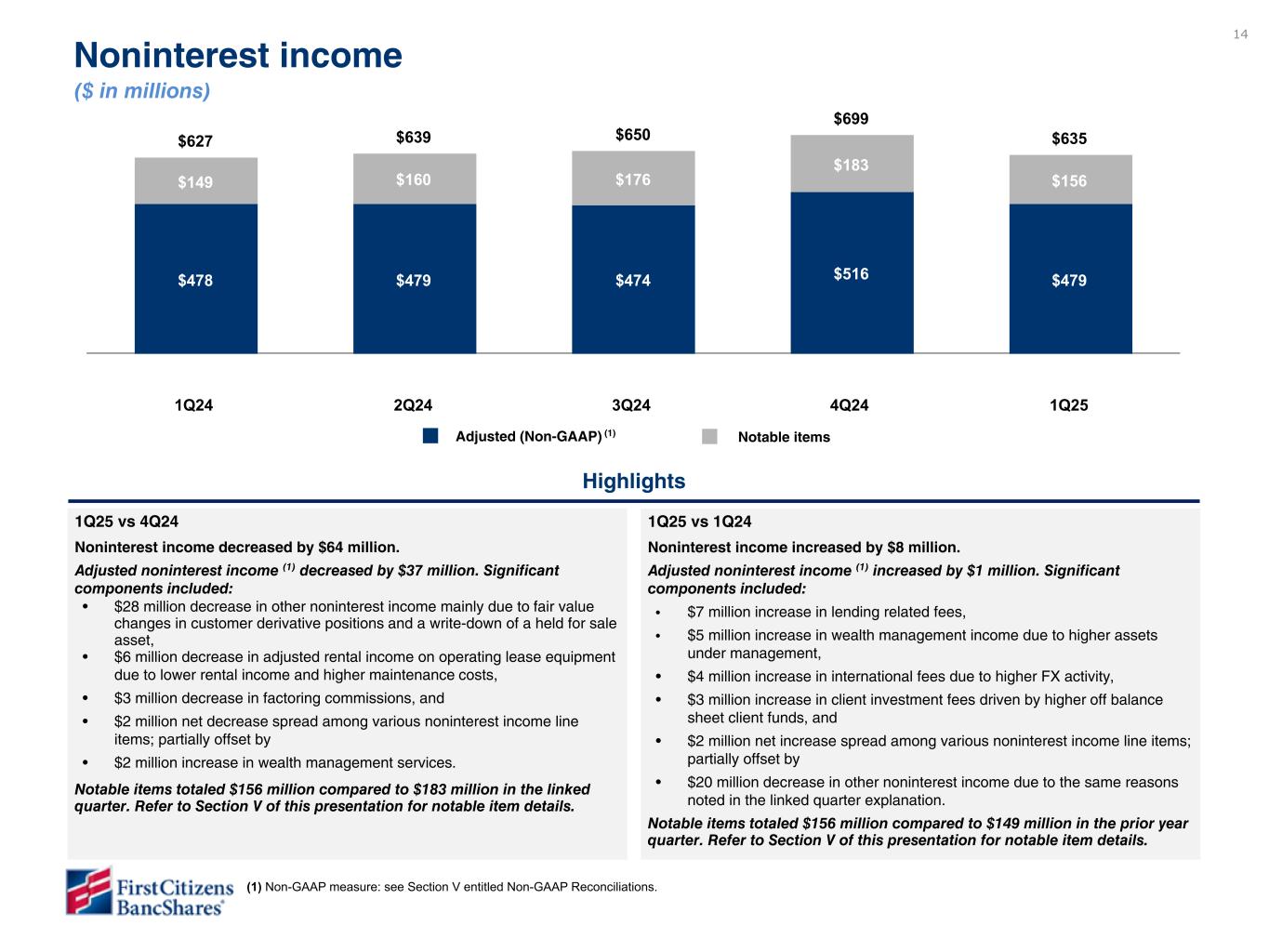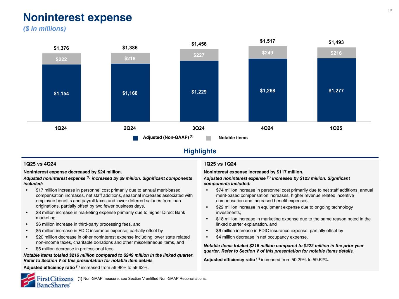 14 $ 627 $ 639 $ 650 $ 699 $ 635 $ 478 $ 479 $ 474 $ 516 $ 479 $ 149 $ 160 $ 176 $ 183 $ 156 1Q24 2Q24 3Q24 4Q24 1Q25 $ 295 $ 156 1Q23 SVB贡献$ 1,940 $ 2,136 $ 996 $ 1,141 $ 944 $ 995 YTD Dec 21 YTD Dec 22 1Q25 vs 4Q24非利息收入减少6400万美元。调整后非利息收入(1)减少3700万美元。重要的组成部分包括:•其他非利息收入减少2800万美元,主要是由于客户衍生品头寸的公允价值变动和一项持有待售资产的减记;•由于租金收入减少和维护成本增加,经营租赁设备的调整后租金收入减少600万美元;•保理佣金减少300万美元;•各种非利息收入细目项之间的净减少200万美元;部分被•财富管理服务增加200万美元所抵消。值得注意的项目总额为1.56亿美元,而上一季度为1.83亿美元。有关值得注意的项目详细信息,请参阅本演示文稿的第五节。YTD22 vs YTD21非利息收入增加1.96亿美元。这一变化的重要组成部分包括:⑤由于与上一季度相同的原因,经营租赁的租金收入增加了9100万美元。经营租赁设备费用下降1600万美元,导致调整后租金收入增加1.07亿美元。丨持卡人服务收入,净增加1500万美元,原因是数量和费用收入增加,其他服务费用增加1400万美元,主要是由于资本市场和投资组合服务费增加。⑤由于经纪交易增加和管理资产增加,财富管理服务增加了1300万美元。⑤其他非利息收入增加了6300万美元的各个项目之间的价差,包括4.31亿美元的议价购买收益,部分被1.47亿美元的投资收益下降以及1.88亿美元的资产和贷款销售收益下降所抵消。亮点非利息收入(百万美元)核心:# # #增加25年第一季度与24年第一季度的非利息收入增加了800万美元。调整后的非利息收入(1)增加了100万美元。重要组成部分包括:•与贷款相关的费用增加700万美元;•由于管理的资产增加,财富管理收入增加500万美元;•由于外汇活动增加,国际费用增加400万美元;•由于表外客户资金增加,客户投资费用增加300万美元;•各种非利息收入项目之间的净增额增加200万美元;由于关联季度解释中提到的相同原因,部分被•其他非利息收入减少2000万美元所抵消。值得注意的项目总额为1.56亿美元,而去年同期为1.49亿美元。有关值得注意的项目详细信息,请参阅本演示文稿的第五节。调整后(Non-GAAP)(1)值得注意的项目149美元-值得注意的项目总额156美元-值得注意的项目总额479美元-调整后(Non-GAAP)总额(1)(1)Non-GAAP衡量标准:见题为Non-GAAP调节的第五节。