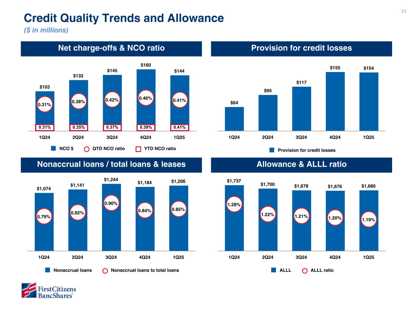 23 $ 64 $ 95 $ 117 $ 155 $ 154信贷损失准备金1Q24 2Q24 3Q24 4Q24 1Q25信贷质量趋势和备抵(百万美元)净冲销& NCO比率拨备信用损失$ 103 $ 132 $ 145 $ 160 $ 1440.31% 0.38% 0.42% 0.46% 0.41% NCO $ QTD NCO比率YTD NCO比率1Q24 2Q24 3Q24 4Q24 1Q25 $ 1,074 $ 1,141 $ 1,244 $ 1,184 $ 1,2060.79% 0.82% 0.90% 0.84% 0.85%非应计贷款占贷款总额1Q24 2Q24 3Q24 4Q24 1Q25非应计贷款/贷款和租赁准备金& ALLL比率$ 1,737 $ 1,700 $ 1,678 $ 1,676 $ 1,676 $ 1,6801.28% 1.22% 1.21% 1.20% 1.19% ALLL比率1Q24 2Q24 3Q24 4Q24 1Q25 0.41% 0.31% 0.35% 0.37% 0.39% to be