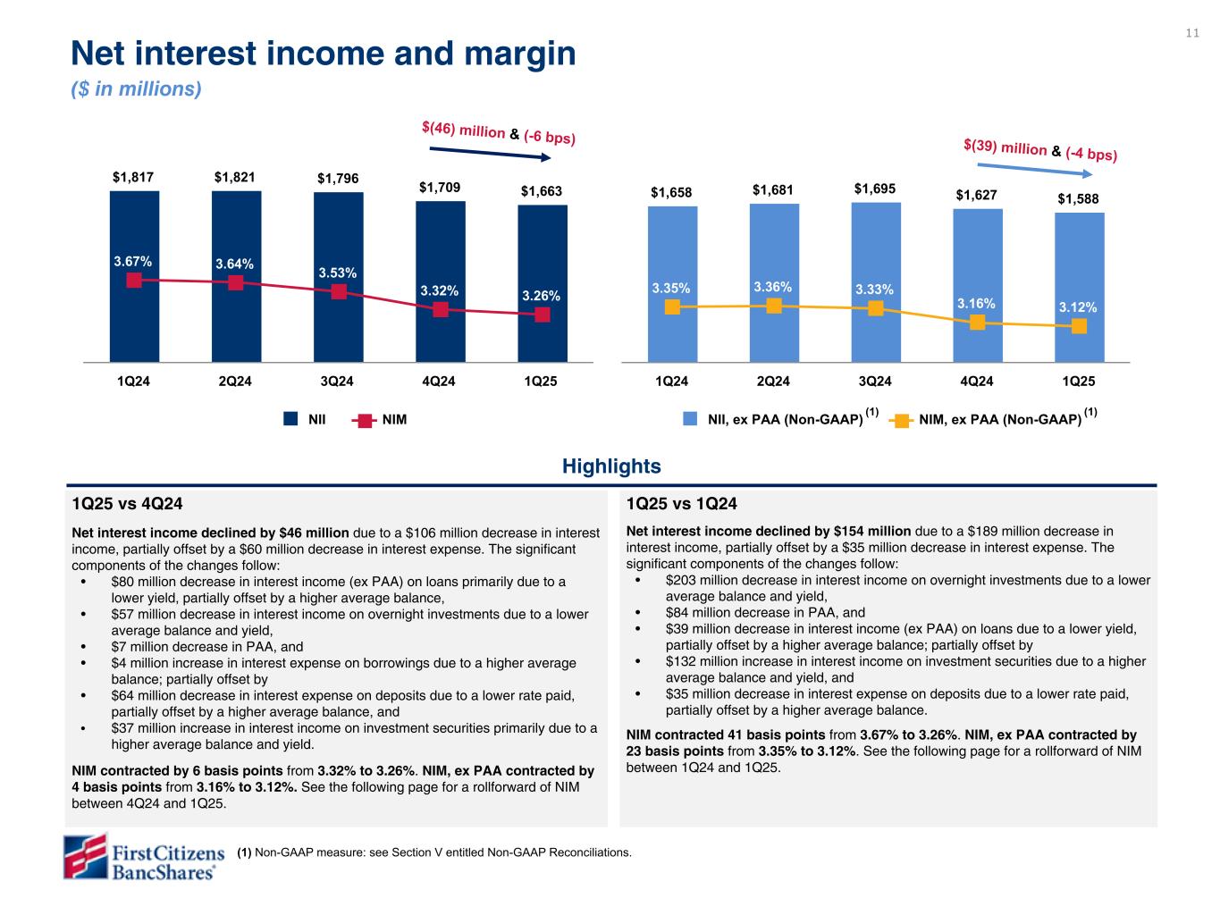 123.67% 0.20% 0.16% 0.08% 0.02%(0.31)%(0.31)%(0.16)%(0.09)% 3.26% 1Q24存款率投资量贷款量债务率/交易量FFS交易量赚取资产收益率PAA存款量1Q25 1Q24至1Q25(-41bps)NIM滚存3.32% 0.13% 0.03%(0.13)%(0.04)%(0.03)%(0.01)%(0.01)% 3.26% 4Q24存款率投资收益率贷款收益率FFS收益率存款量赚取资产组合PAA 1Q25 4Q24至1Q25(-6 bps)(1)包括2023年3月27日至2023年3月31日期间的采购会计影响。方案2-将收益资产组合和/或收益率汇总在一起,类似于上个季度采取的方法。