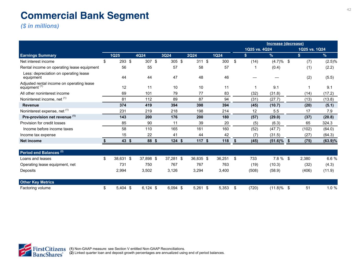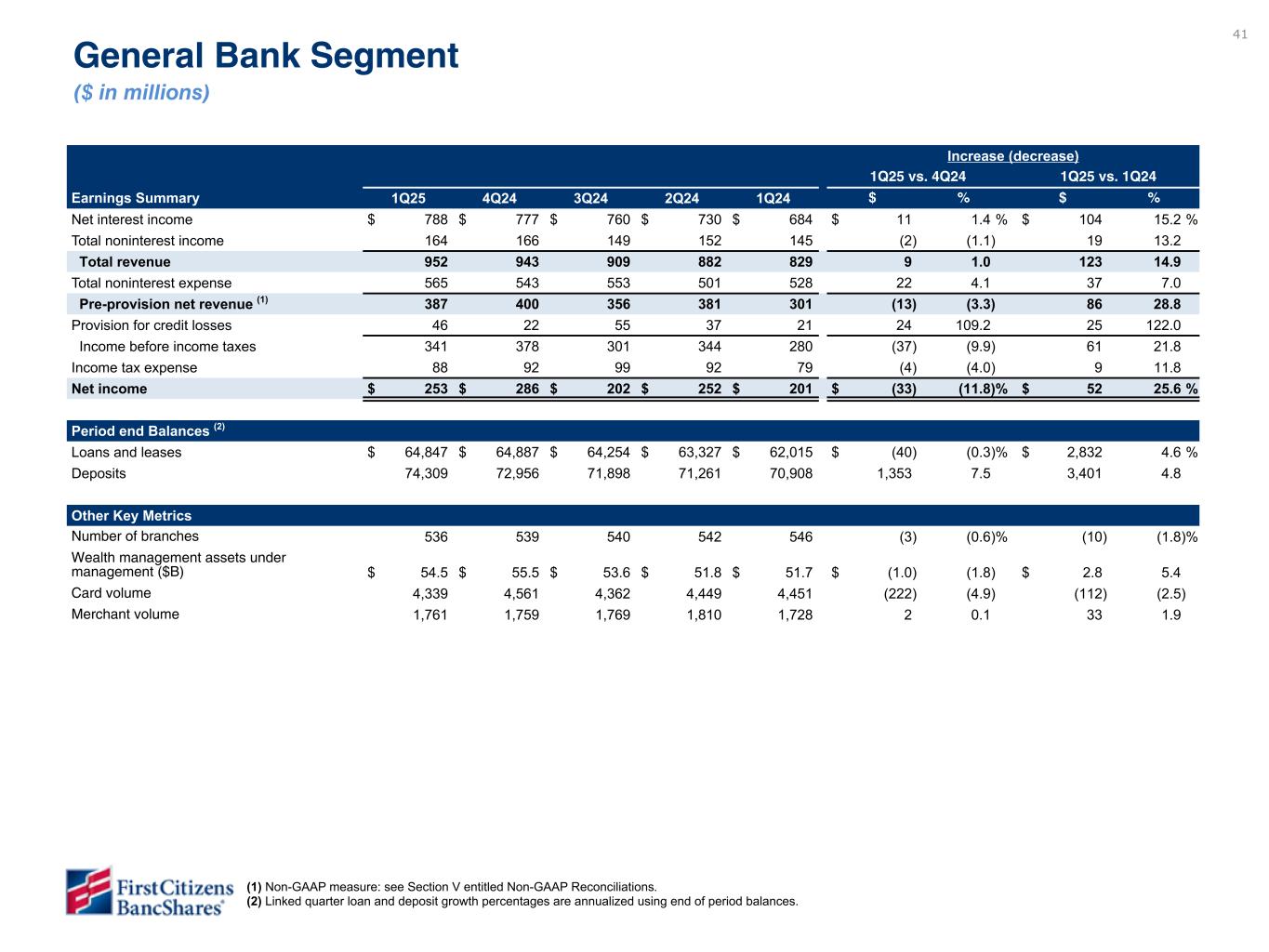 41普通银行部门(百万美元)(1)Non-GAAP衡量:见题为Non-GAAP调节的第五节。(2)挂钩季度贷款和存款增长百分比使用期末余额进行年化。增加(减少)1Q25 vs. 4Q24 1Q25 vs. 1Q24收益摘要1Q25 4Q24 3Q24 2Q24 1Q24 $% $%净利息收入$ 788 $ 777 $ 760 $ 730 $ 684 $ 111.4% $ 10415.2%非利息收入总额164166149152145(2)(1.1)1913.2总收入95294390988282991.01 2314.9非利息支出总额565543553501528224.13 77.0拨备前净收入(1)387400356381301(13)(3.3)8628.8拨备信用损失462255372124109.225122.0所得税前收入341378301344280(37)(9.9)6121.8所得税费用889 2999279(4)(4.0)911.8净收入$ 253 $ 286 $ 202 $ 252 $ 201 $(33)(11.8)% $ 5225.6%期末余额(2)贷款和租赁$ 64,847 $ 64,887 $ 64,254 $ 63,327 $ 62,015 $(40)(0.3)% $ 2,8324.6%存款74,30972,95671,89871,26170,9081,3537.53,4014.8其他关键指标分支机构数量536539540542546(3)(0.6)%(10)(1.8)%管理的财富管理资产($ B)$ 54.5 $ 55.5 $ 53.6 $ 51.8 $ 51.7 $(1.0)(1.8)$ 2.85.4卡数量4,3394,5614,3624,4494,451(222)(4.9)(112)(2.5)商户数量1,7611,7591,7691,8101,72820.13 31.9亮点•一般银行部门实现强劲本季度增长,环比年化4.1%,主要受分行网络业务和商业贷款生产的推动。•由于分支机构网络的增长,与上一季度相比,存款增加了8.93亿美元。•与上一季度相比,分部净收入增加了3200万美元,净利息收入增加了1500万美元,非利息收入增加了1700万美元。非利息支出与上一季度相比减少了2000万美元。请不要复核-数据不可用。将在以后的草案中提供。数据尚未得到验证。待后续草案定稿。