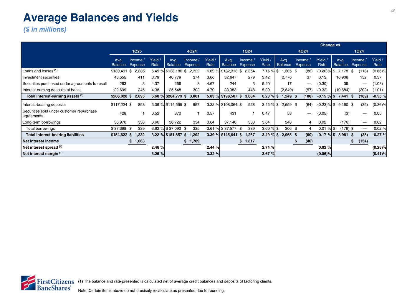 40变化vs. 1Q25 4Q24 1Q24 4Q24 1Q24 avg。余额收入/费用收益率/费率平均余额收入/费用收益率/费率平均余额收入/费用收益率/费率平均余额收入/费用收益率/费率平均余额收入/费用收益率/利率贷款和租赁(1)$ 139,491 $ 2,2366.49% $ 138,186 $ 2,3226.69% $ 132,313 $ 2,3547.15% $ 1,305 $(86)(0.20)% $ 7,178 $(118)(0.66)%投资证券43,5554113.7940,7793743.6632,6472793.42 2,776370.13 10,9081320.37根据转售协议购买的证券28334.3726634.67 24435.4017 —(0.30)39 —(1.03)银行生息存款22,6992454.3825,5483024.7033,3834485.39(2,849)(57)(0.32)(10,684)(203)(1.01)生息资产总额(1)$ 206,028 $ 2,89$ 204,779 $ 3,0015.83% $ 198,587 $ 3,0846.23% $ 1,249 $(106)-0.15 % $ 7,441 $(189)-0.55 %计息存款$ 117,224 $ 8933.09% $ 114,565 $ 9573.32% $ 108,064 $ 9283.45% $ 2,659 $(64)(0.23)% $ 9,160 $(35)(0.36)%根据客户回购协议出售的证券42810.52 37010.5743110.4758 —(0.05)(3)— 0.05长期借款36,9703383.6636,7223343.64 37,1463383.64 24840.02(176)—0.02借款总额$ 37,398 $3393.62% $ 37,092 $ 3353.61% $ 37,577 $ 3393.60% $ 306 $ 40.01% $(179)$ — 0.02%有息负债总额$ 154,622 $ 1,2323.22% $ 151,657 $ 1,2923.39% $ 145,641 $ 1,2673.49% $ 2,965 $(60)-0.17 % $ 8,981 $(35)-0.27 %净利息收入$ 1,663 $ 1,709 $ 1,817 $(46)$(154)净利差(1)2.46% 2.44% 2.74% 0.02%(0.28)%净息差(1)3.26% 3.32% 3.67%(0.06)%(0.41)%变动vs. YTD23 YTD22 YTD22 avg。余额收入/费用收益率/费率平均余额收入/费用收益率/费率平均余额收入/费用收益率/利率贷款及租赁(1)$ 66,634 $ 2,9534.41% $ 65,639 $ 2,6974.09% $ 995 $ 2560.32%投资证券19,1663541.85 16,1102161.323,0561380.53银行生息存款7,7261061.3813,246170.13(5,520)891.25生息资产总额(1)$ 93,526 $ 3,4133.63% $ 94,995 $ 2,9303.07% $(1,469)$ 4830.56%计息存款$ 63,598 $ 335 0.53% $ 65,295 $ 2390.37% $(1,697)$ 96 0.16%根据客户回购协议出售的证券59010.1966010.20(70)—(0.01)其他短期借款824283.30 ———— 824283.30长期借款3,8821032.645,9152494.15(2,033)(146)(1.51)借款总额$ 5,296 $ 1322.47% $ 6,575 $ 2503.75% $(1,279)$(118)(1.28)%有息负债总额$ 68,894 $ 4670.68% $ 71,870 $ 4890.68% $(2,976)$(22)—%净利息收入$ 2,946 $ 2,441 $ 505净利差(1)2.95% 2.39% 0.56%净息差(1)3.14% 2.55% 0.59%平均余额和收益率(百万美元)年初至今未披露Q1(1)列报的余额和利率是扣除保理客户的平均信贷余额和存款后计算得出的。注:由于四舍五入的原因,上述某些项目并未准确按列报方式重新计算。