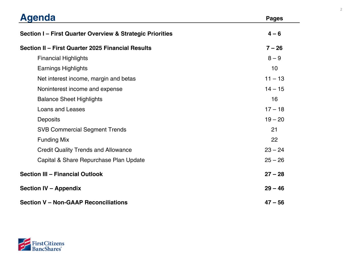 2个议程页第一节–第一季度概览和战略优先事项4 – 6第二节– 2025年第一季度财务业绩7 – 26财务亮点8 – 9收益亮点10净利息收入,保证金和贝塔11 – 13非利息收入和支出14 – 15资产负债表重点16贷款和租赁17 – 18存款19 – 20 SVB商业部门趋势21资金混合22信用质量趋势和备抵23 – 24资本和股份回购计划更新25 – 26第三节–财务展望27 – 28第四节–附录29 – 46第五节–非公认会计准则调节47 – 56请不要审查。将在以后的草案中提供