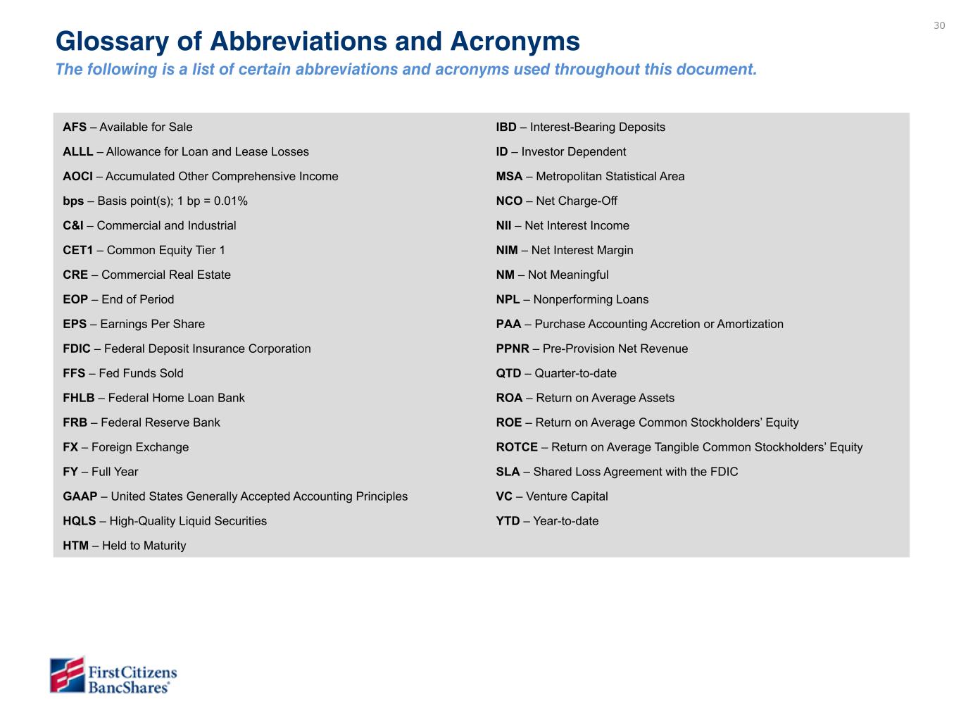 30缩略语和缩略语词汇表以下是本文档中使用的某些缩略语和缩略语的列表。AFS –可供出售ALLL –贷款和租赁损失准备金AOCI –累计其他综合收益bps –基点;1个bp = 0.01% C & I –商业和工业CET1 –普通股一级CRE –商业地产EOP –期末EPS –每股收益FDIC –联邦存款保险公司FFS –联邦基金出售FHLB –联邦Home Loan银行FRB –联邦储备银行外汇–外汇FY –全年GAAP –美国公认会计原则HQLS –高质量流动性证券HTM –持有至到期丨IBD丨–有息存款ID –投资者依赖的MSA –大都市统计区NCO –净冲销NII –净利息收入NIM –净息差NM –无意义不良贷款–不良贷款PAA –购买会计增值或摊销PPNR –拨备前净收入QTD –季度至今ROA –平均资产回报率ROE –平均普通股股东权益ROTCE回报率–平均有形普通股股东权益回报率SLA –与FDIC VC的分担损失协议–风险投资年初至今–年初至今1Q25财年增加–全年1Q25去除LFI –大型金融机构TBV –有形账面价值档案ACL –津贴对于信用损失CAB-社区协会银行业务NIB-无息RBC-基于风险的资本TA-有形资产TCE-有形普通股AUM –管理资产AWA – Affluent Wealth Advisors LIBOR –伦敦银行间同业拆借利率LOC –信用额度MSA – Metropolitan Statistic Area PE – Private Equity RIA –注册投资顾问SOFR –有担保隔夜融资利率有限公司–长期债务RWA –风险加权资产丨ACH –自动清算所CECL –当前预期信用损失ETF –交易所交易基金FFR –联邦基金利率IPO –首次公开募股LP –有限合伙人VC –风险投资AI –人工智能FFR –联邦基金利率FY –全年GFB –全球基金银行业务OBS –表外客户资金PCD –随着信息变得更加具体,购买的信用恶化,将在随后的草案中更新-将在随后的草案中提供