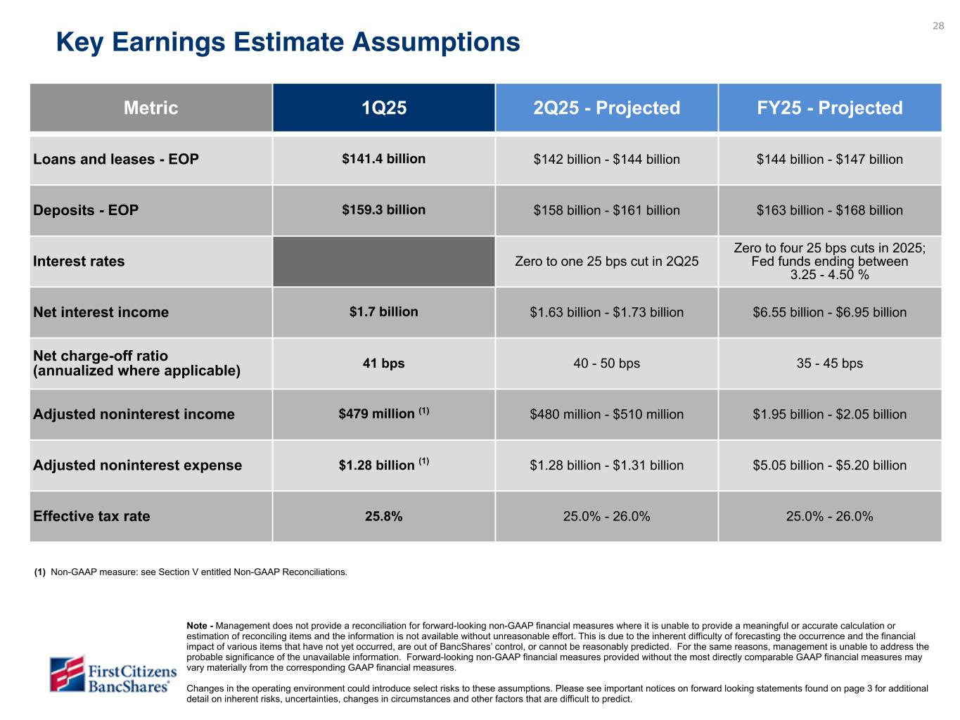 28指标1Q25 2Q25-预计FY25-预计贷款和租赁-执行任务1414亿美元1420亿美元1440亿美元1440亿美元1440亿美元1470亿美元存款-执行任务1593亿美元1580亿美元1610亿美元1630亿美元1680亿美元2025年第二季度利率从零到一次下调25个基点从零到四次下调25个基点;联邦基金在3.25-4.50 %之间结束净利息收入17亿美元16.3亿美元17.3亿美元65.5亿美元-69.5亿美元净冲销率(年化如适用)41个基点40-50个基点35-45个基点调整后非利息收入4.79亿美元(1)4.8亿美元-5.1亿美元19.5亿美元-20.5亿美元调整后非利息支出12.8亿美元(1)12.8亿美元-13.1亿美元50.5亿美元-52.0亿美元有效税率25.8% 25.0%-26.0% 25.0%-26.0%关键盈利估计假设请不要审查。将在后续草案(1)Non-GAAP衡量标准中提供的数据:见题为Non-GAAP调节的第五节。注意-如果管理层无法提供对调节项目的有意义或准确的计算或估计,并且没有不合理的努力就无法获得信息,则管理层不会提供前瞻性非公认会计原则财务措施的调节。这是由于对尚未发生、不受BancShares控制或无法合理预测的各种项目的发生和财务影响进行预测具有内在的难度。出于同样的原因,管理层无法解决无法获得的信息的可能重要性。在没有最直接可比的GAAP财务指标的情况下提供的前瞻性非GAAP财务指标可能与相应的GAAP财务指标存在重大差异。经营环境的变化可能会给这些假设带来选择性风险。有关固有风险、不确定性、环境变化和其他难以预测的因素的更多详细信息,请参阅第3页中关于前瞻性陈述的重要通知。待后续草案更新