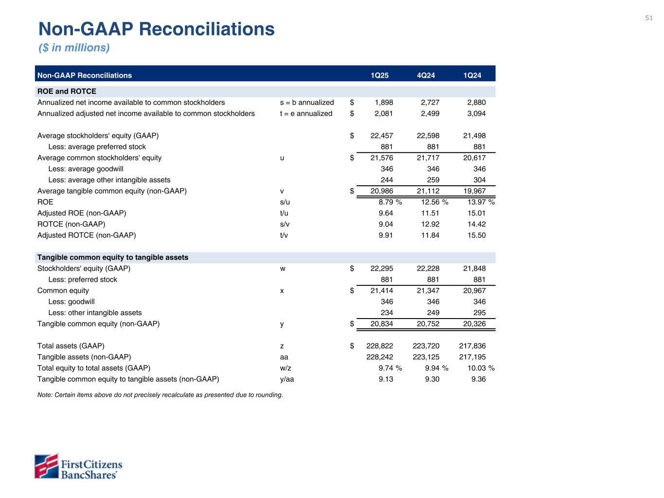 50非GAAP对账(百万美元)非GAAP对账1Q25 4Q24 1Q24 PPNR净收入(GAAP)a $ 483700731加:拨备信用损失15415564加:所得税费用16836273 PPNR(non-GAAP)l $ 8058911,068显着项目的影响606673调整后PPNR(non-GAAP)m $ 8659571,141 ROA净收入(GAAP)a $ 483700731年化净收入n =年化1,9562,7862,942调整后净收入(non-GAAP)d 528643784年化调整后净收入p = d年化2,1392,5583,156平均资产o 225,449223,706216,081 ROA n/o 0.87% 1.25% 1.36%调整后ROA(non-GAAP)p/o 0.95 1.14 1.46 PPNR ROA PPNR(non-GAAP)l $8058911,068年化PPNR q = l年化3,2643,5454,296调整后PPNR(非公认会计原则)m 8659571,141年化调整后PPNR r = m年化3,5073,8094,589 PPNR ROA(非公认会计原则)q/o 1.45% 1.58% 1.99%调整后PPNR ROA(非公认会计原则)r/o 1.56 1.70 2.12注:由于四舍五入,上述某些项目未按列报方式准确重新计算。