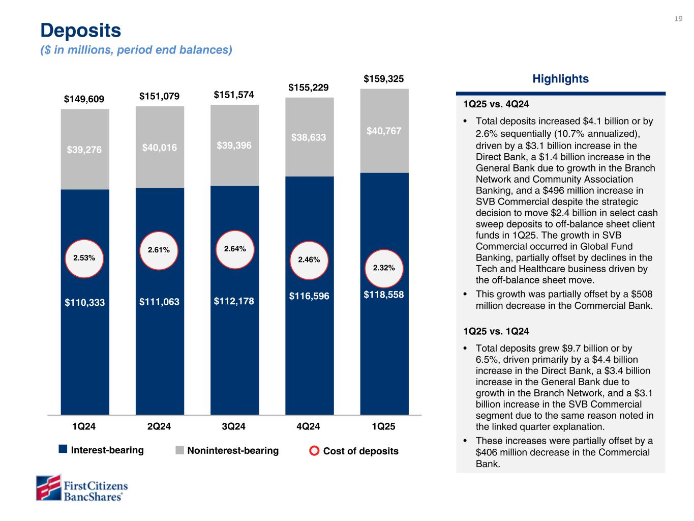 17 $ 135,370 $ 139,341 $ 138,695 $ 140,221 $ 141,358 $ 62,0 15 $ 63,327 $ 64,254 $ 64,887 $ 64,847 $ 36,313 $ 36,897 $ 37,343 $ 37,960 $ 38,693 $ 37,042 $ 39,117 $ 37,098 $ 37,374 $ 37,818 General Bank Commercial Bank SVB Commercial Yield on Loans 1Q24 2Q24 3Q24 4Q24 1Q25 Highlights 1Q25 vs 4Q24 •贷款总额环比增加11亿美元或0.8%(年化3.3%)。贷款增加是由商业银行增加7.33亿美元和SVB商业增加4.44亿美元推动的,部分被普通银行减少4000万美元所抵消。•商业银行的增长是由我们行业垂直领域的持续强劲表现推动的,主要是科技媒体和电信和医疗保健,以及我们的商业服务(又名保理)业务的更高余额。SVB商业增长集中在全球基金银行业。•普通银行分部的减少是由于分行网络的商业贷款下降,部分被我们财富业务的贷款增长所抵消。25年第一季度对比24年第一季度•贷款总额增加60亿美元或4.4%。贷款增加是由通用银行增加28亿美元(4.6%)、商业银行增加24亿美元(6.6%)以及SVB商业部门增加7.76亿美元(2.1%)推动的。•一般银行贷款增长是由分行网络中的商业和经营贷款推动的。商业银行贷款增长集中在我们的行业垂直领域。瑞士银行商业贷款增长是由全球基金银行业务推动的,但部分被科技和医疗保健业务的下降所抵消。贷款和租赁(百万美元,期末余额)6.69% 7.03% 7.15% 7.15% 6.49% 10.1%(1)(1)商业银行包括少量铁路贷款(所有期间均低于1亿美元)。铁路经营性租赁资产不计入贷款总额。突出评论正在与企业进行验证