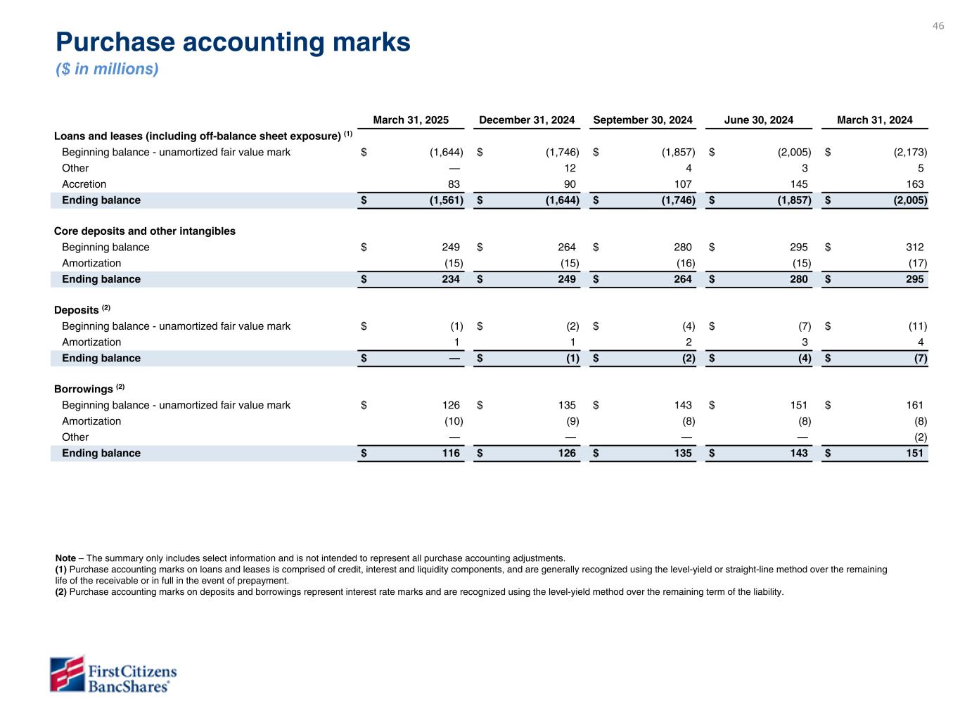 462025年3月31日2024年12月31日2024年9月30日2024年6月30日2024年3月31日,2024年贷款和租赁(包括表外风险)(1)期初余额-未摊销公允价值标记$(1,644)$(1,746)$(1,857)$(2,005)$(2,173)其他— 12435应计8390107145163期末余额$(1,561)$(1,644)$(1,746)$(1,857)$(2,005)核心存款及其他无形资产期初余额$ 249 $ 264 $ 280 $ 295 $ 312摊销(15)(15)(16)(15)(17)期末余额$ 234 $ 249 $ 264 $ 280 $ 295存款(2)期初余额-未摊销公允价值标记$(1)$(2)$(4)$(7)$(11)摊销11234期末余额$ — $(1)$(2)$(4)$(7)借款(2)期初余额-未摊销公允价值标记$ 126 $ 135 $ 143 $ 151 $ 161摊销(10)(9)(8)(8)其他————(2)期末余额116美元126美元135美元143美元151美元采购会计标记(百万美元)注——摘要仅包括选定信息,并非旨在代表所有采购会计调整。(1)贷款和租赁上的采购会计标记由信用、利息和流动性成分组成,一般在应收款的剩余期限内或在提前还款的情况下采用水平收益率或直线法确认。(2)存款和借款上的购买会计标记为利率标记,在负债的剩余期限内采用水平收益率法确认。