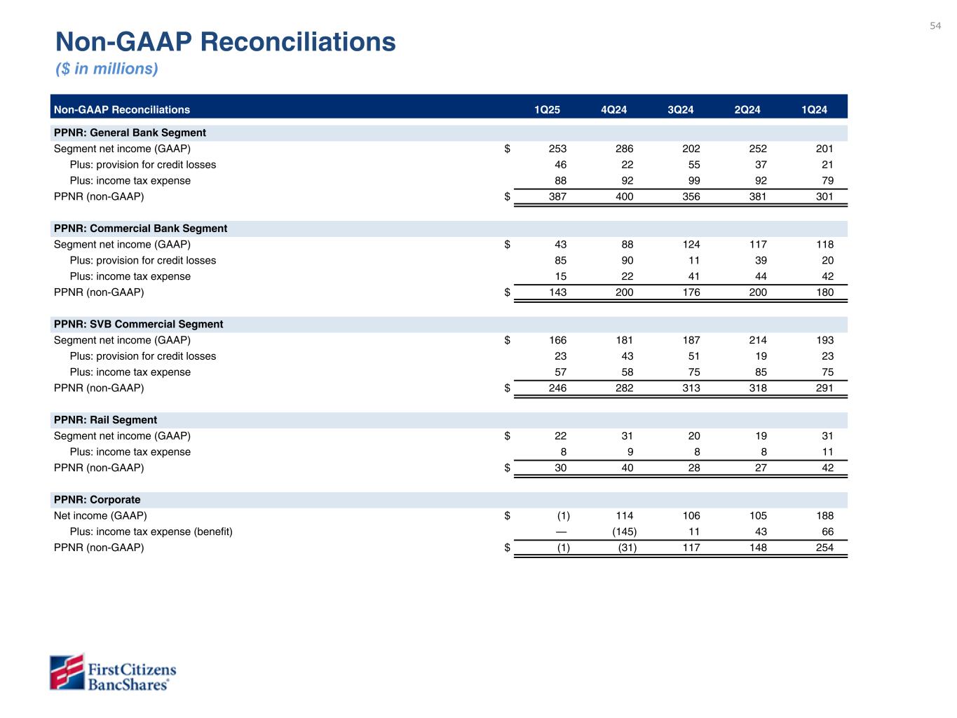 54非美国通用会计准则调节(百万美元)非美国通用会计准则调节1Q25 4Q24 3Q24 2Q24 1Q24 PPNR:一般银行分部净收入(GAAP)253286202252201加:信贷损失准备金4622553721加:所得税费用889 2999279 PPNR(non-GAAP)387400356381301 PPNR:商业银行分部净收入(GAAP)4388124117118加:拨备信贷损失8590113920加:所得税费用1522414442 PPNR(非公认会计原则)143200176200180 PPNR:SVB商业部门部门净收入(公认会计原则)166181187214193加:拨备信用损失2343511923加:所得税费用5758758575 PPNR(非公认会计原则)246282313318291美元PPNR:铁路部门部门净收入(公认会计原则)2231201931加:所得税费用898811 PPNR(非公认会计原则)3040282742美元PPNR:企业净收入(公认会计原则)$(1)114106105188加:所得税费用(收益)—(145)114366 PPNR(非公认会计原则)$(1)(31)117148254