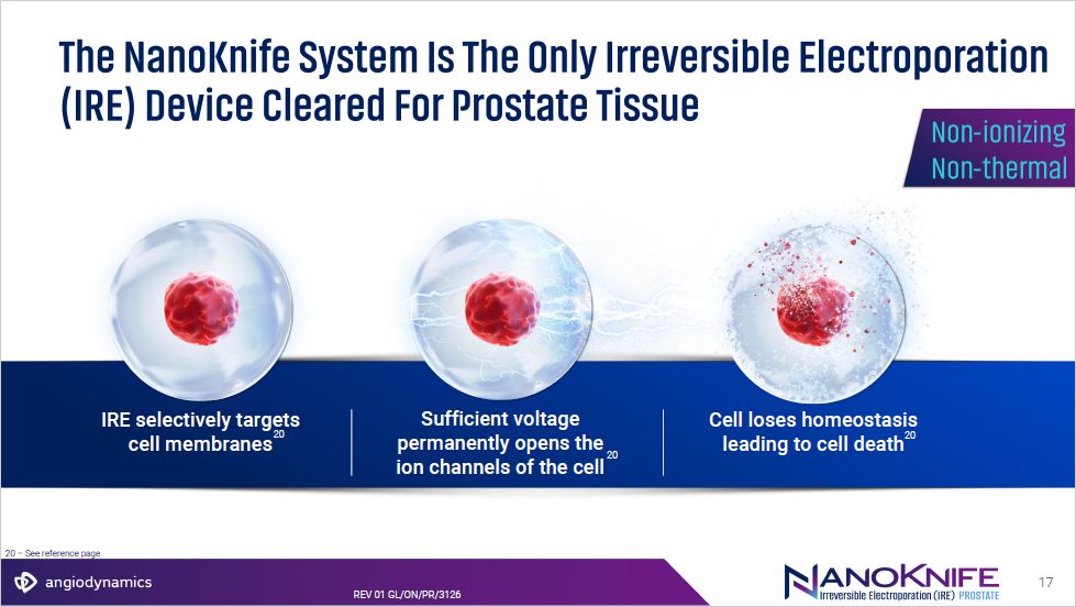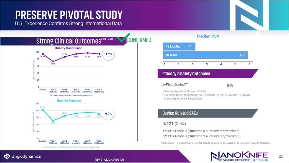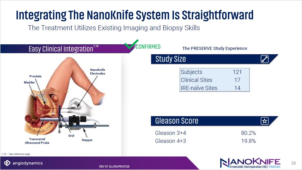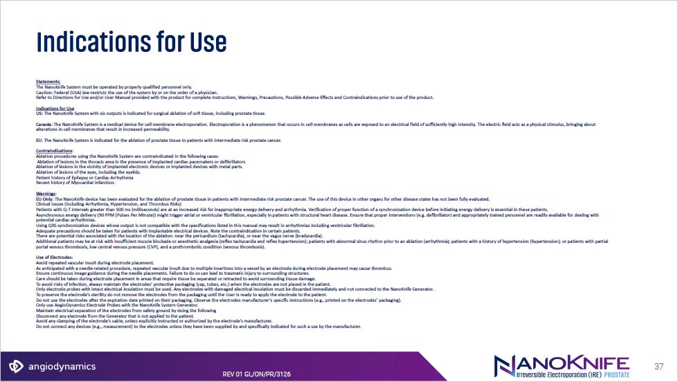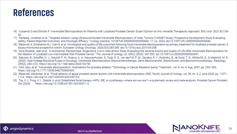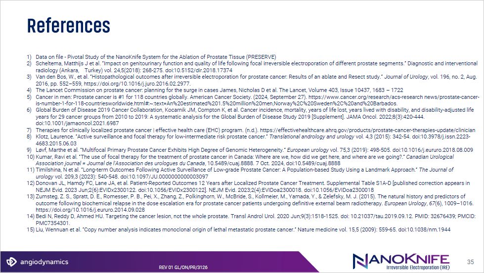 Data on file-NanoKnife system for ablation of prostate tissue(PRESERVE)Scheltema的关键研究,Matthijs J et al.“对不同前列腺节段的局灶不可逆电穿孔后的泌尿生殖功能和生活质量的影响。”诊断和介入放射学(土耳其安卡拉)vol. 24,5(2018):268-275. doi:10.5 152/dir.2018.17 374 Van den Bos,W.,et al.“前列腺癌不可逆电穿孔后的组织病理学结果:消融和切除研究的结果。”Journal of Urology,vol. 196,No. 2,August 2016,pp. 552 – 559,https://doi.org/10.1016/j.juro.2016.02.2977。Lancet Commission on Prostate Cancer:Planning for the激增cases James,Nicholas D et al. The Lancet,Volume 403,Issue 10437,1683 – 1722 Cancer in Men:Prostate Cancer is # 1 for 118 countries globally。美国癌症协会。(2024年9月27日)。https://www.cancer.org/research/acs-research news/prostate-cancer-is-number-1-for-118-countriesworldwide.html#:~:text=AN%20estimated%201.5% 20million%20men,Norway % 2C%20Sweden % 2C%20and % 20Barbados。Global Burden of Disease 2019 Cancer Collaboration,Kocarnik JM,Compton K,et al. 2010-2019年29个癌症群体的癌症发病率、死亡率、生命损失年数、残疾生活年数和残疾调整生命年数:2019年全球疾病负担研究的系统分析[补充]。JAMA Oncol。2022;8(3):420-444。doi:10.1001/jamaoncol.2021.6987临床局限性前列腺癌的治疗|有效健康护理(EHC)计划。(N.D.)。https://effectivehealthcare.ahrq.gov/products/prostate-cancer-therapies-update/clinician Klotz,Laurence。“低中风险前列腺癌的主动监测和焦点治疗。”Translational Andrology and Urology vol. 4,3(2015):342-54. doi:10.3978/j.issn.2223-4683.2015.06.03 L ø vf,Marthe et al.“多灶性原发性前列腺癌表现出高度的基因组异质性。”European urology vol. 75,3(2019):498-505. doi:10.10 16/j.eururo.2018.08.009 Kumar,Ravi et al.“在加拿大使用焦点疗法治疗前列腺癌:我们在哪里,我们是如何来到这里的,我们将去哪里?。”加拿大泌尿外科协会期刊= Journal de l'Association des urologues du Canada,10.5489/cuaj.8888。2024年10月7日,doi:10.5489/cuaj.8888 Timilshina,N等人“积极监测低级别前列腺癌后的长期结果:一项使用标志性方法的基于人群的研究。”The Journal of Urology vol. 209,3(2023):540-548.doi:10.1097/JU.0000000000003097 Donovan JL,Hamdy FC,Lane JA,et al.患者报告的结果在前列腺癌局部治疗12年后。补充表格S1A-D [ NEJM EVID中出现已发布的更正。2023 Jun;2(6):EVIDX2300122.doi:10.1056/EVIDX2300122 ]。NEJM艾维德。2023;2(4):EVIDOA2300018.doi:10.1056/EVIDOA2300018 Zumsteg,Z. S.,Spratt,D. E.,Romesser,P. B.,Pei,X.,Zhang,Z.,Polkinghorn,W.,McBride,S.,Kollmeier,M.,Yamada,Y.,& Zelefsky,M. J.(2015)。接受确定性外照射放疗的前列腺癌患者在剂量递增时代生化复发后的自然史和预后预测因子。欧洲泌尿外科,67(6),1009 – 1016. https://doi.org/10.1016/j.euro.2014.09.028 Bedi N,Reddy D,Ahmed HU。靶向癌症病灶,而不是整个前列腺。翻译Androl Urol。2020年6月;9(3):1518-1525。doi:10.2 1037/tau.2019.09.12。PMID:32676439;PMCID:PMC7354301。Liu,Wennuan et al.“拷贝数分析表明致死性转移性前列腺癌的单克隆起源。”Nature Medicine vol. 15,5(2009):559-65. doi:10.1038/nm.1944 35 REV 01 GL/on/PR/3126