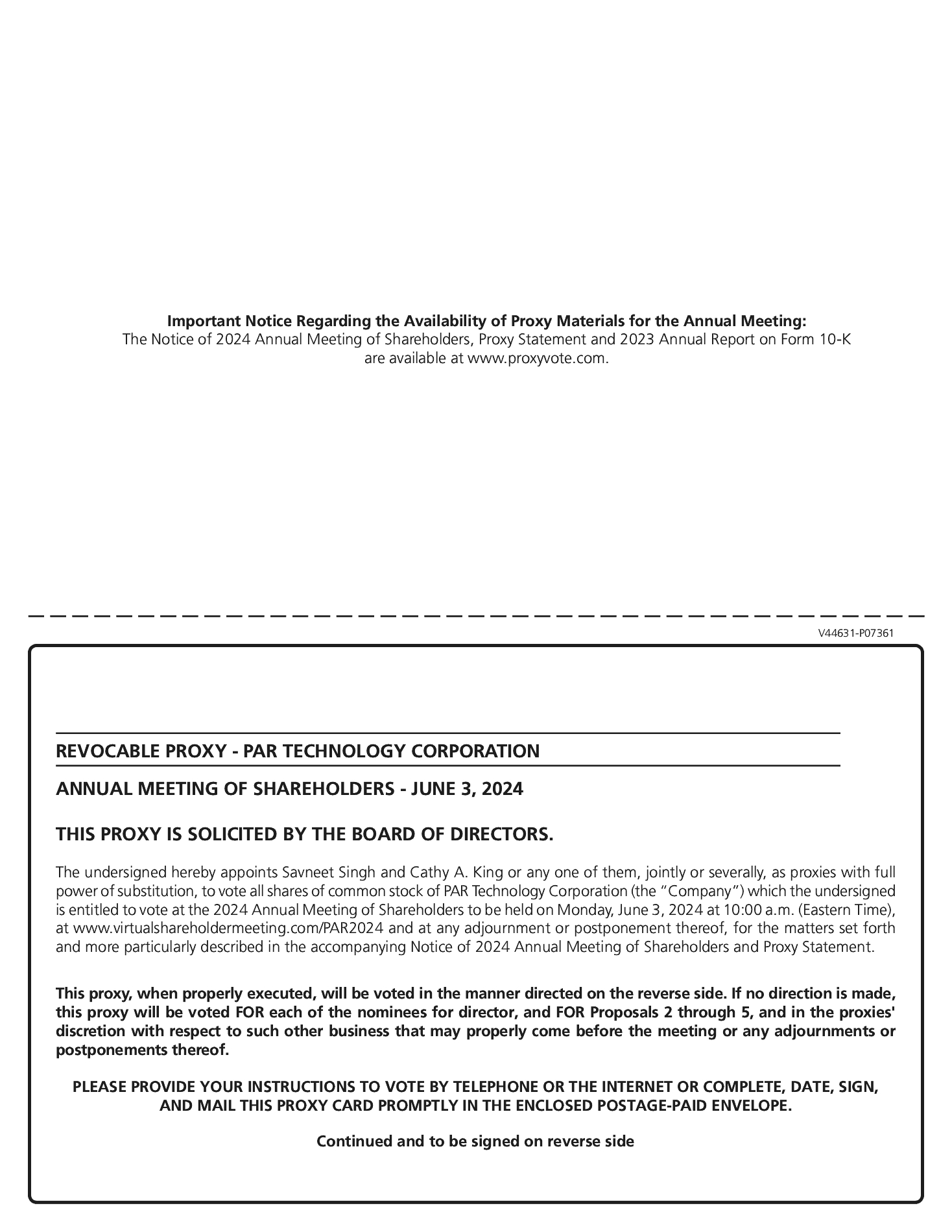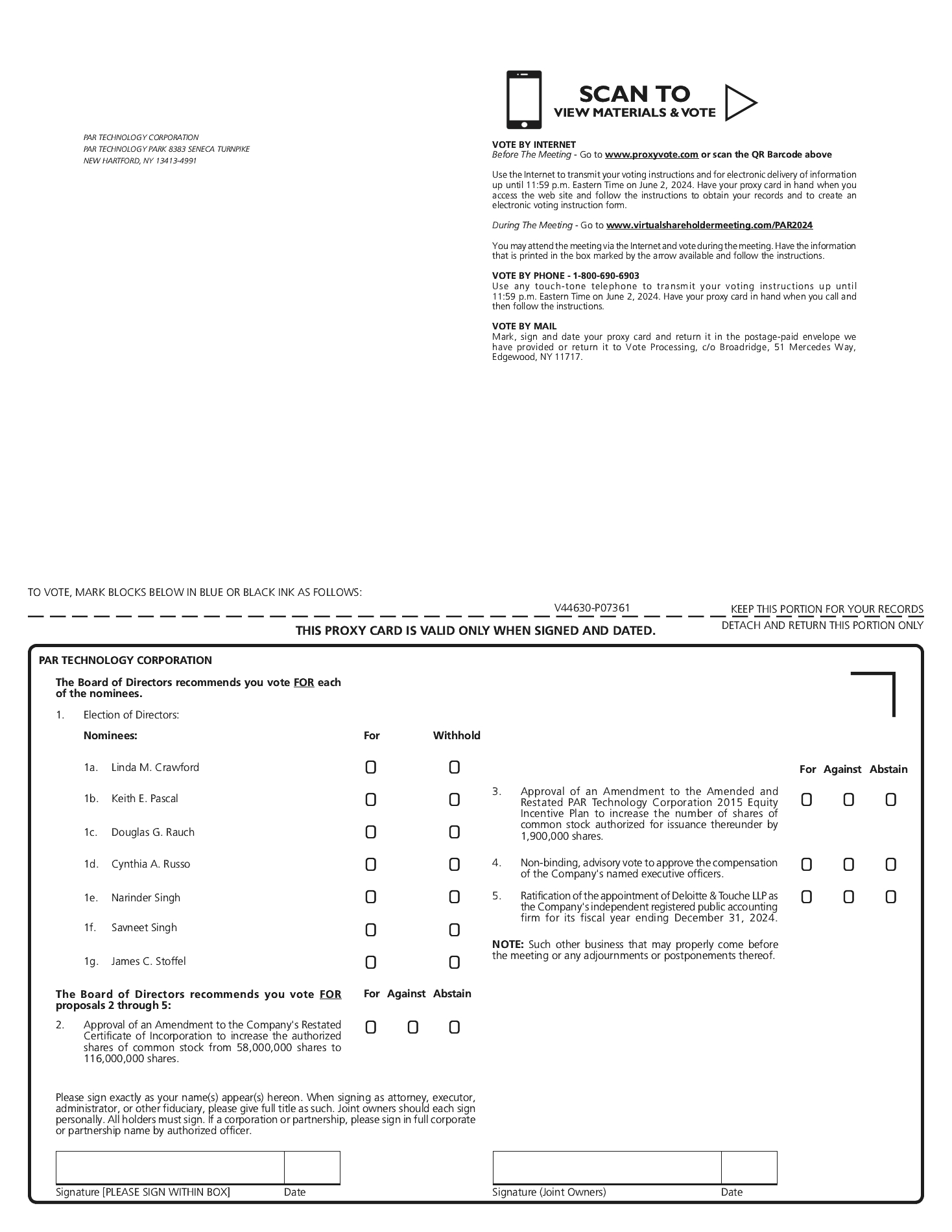 批准对经修订和重述的《PAR技术公司2015年股权激励计划》进行修订,将根据该计划授权发行的普通股股票数量增加1,900,000股。