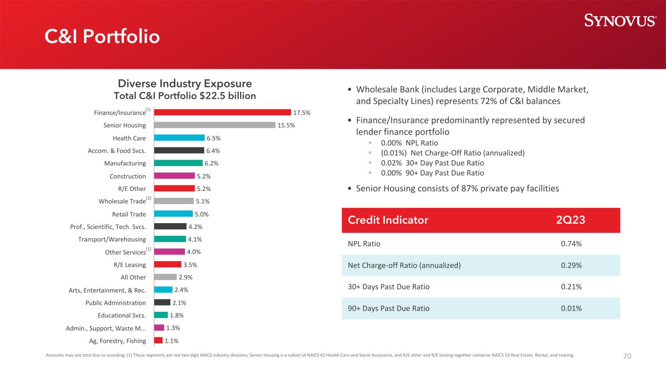 20信贷指标2Q23不良贷款率0.74%净销账率(年化)0.29% 30 +天逾期未偿还比率0.21% 90 +天逾期未偿还比率0.01% •批发银行(包括大型企业、中型市场,和特殊项目)占C & I余额的72% •金融/保险主要由有担保的贷款人融资组合所代表③ 0.00%不良贷款比率③(0.01%)净销账比率(年化)③ 0.02% 30 +日逾期未偿比率③ 0.00% 90 +日逾期未偿比率•老年住房包括87%的私人支付设施多样化行业风险敞口C & I投资组合总额225亿美元17.5% 15.5% 6.5% 6.4% 6.2% 5.2% 5.2% 5.2% 5.1% 5.0% 5.0% 4.2% 4.1% 4.0% 3.5% 2.9% 2.4% 2.1% 1.8% 1.3% 1.1%金融/保险老年住房医疗保健账户。& Food Svcs。制造建筑R/E其他批发贸易零售贸易教授,科学,技术。运输/仓储其他服务R/E租赁All Other Arts,Entertainment,& Rec。公共行政教育Svcs。管理员,支持,废物M..。由于四舍五入的关系,农业、林业、渔业的总金额可能不相加;(1)这些部分不是NAICS行业的两位数部门;老年住房是NAICS 62医疗保健和社会援助的一个子集,R/E其他和R/E租赁一起构成NAICS 53房地产、租赁和租赁。(1)(1)(1)C & I投资组合