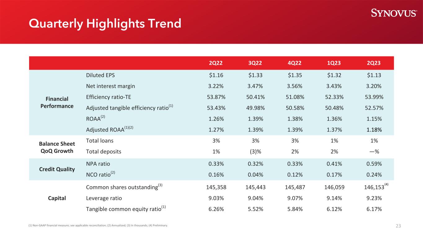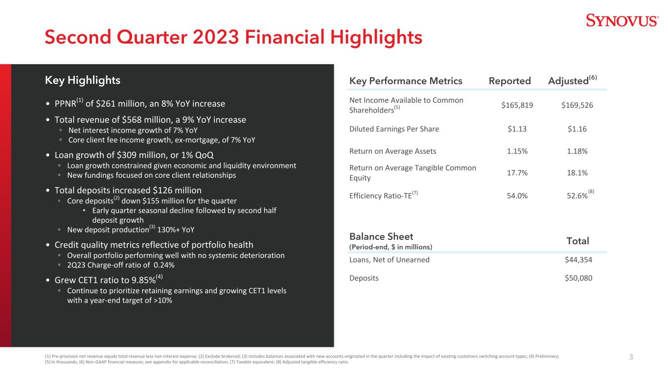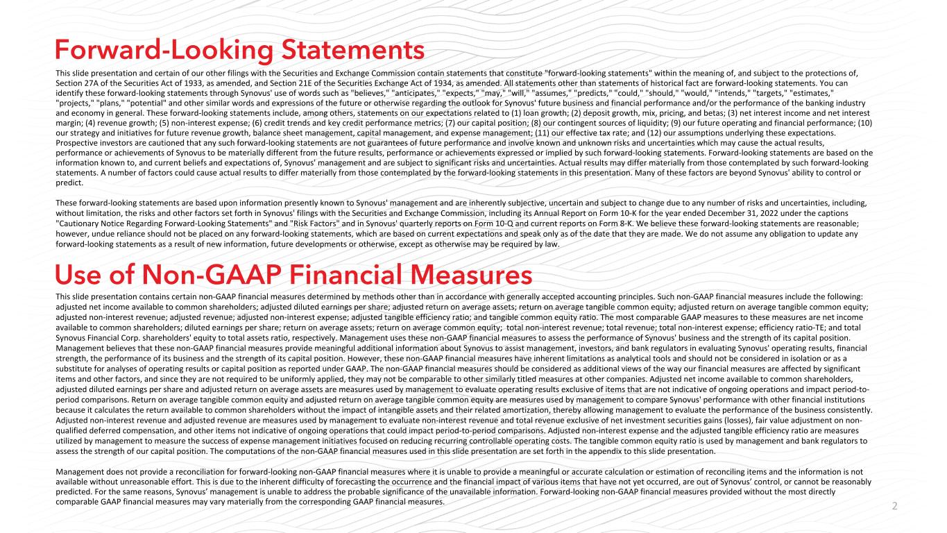 2本幻灯片演示文稿和我们向美国证券交易委员会提交的某些其他文件中包含的陈述构成“前瞻性陈述”,这些陈述属于经修订的1933年《证券法》第27A条和经修订的1934年《证券交易法》第21E条的含义,并受其保护。除历史事实陈述外,所有陈述均为前瞻性陈述。您可以通过Synovus使用诸如“相信”、“预期”、“预期”、“可能”、“将”、“假设”、“预测”、“可能”、“应该”、“将”、“打算”、“目标”、“估计”、“项目”、“计划”、“潜力”等类似的词语和表达方式来识别这些前瞻性陈述,这些词语和表达方式涉及Synovus未来业务和财务业绩的前景以及/或银行业和经济的总体表现。这些前瞻性陈述包括以下内容:(1)贷款增长;(2)存款增长、组合、定价和贝塔系数;(3)净利息收入和净息差;(4)收入增长;(5)非利息支出;(6)信贷趋势和关键信贷绩效指标;(7)我们的资本状况;(8)我们的或有流动性来源;(9)我们未来的运营和财务业绩;(10)我们未来收入增长、资产负债表管理、资本管理和费用管理的战略和举措;(11)我们的有效税率;以及(12)我们基于这些预期的假设。请潜在投资者注意,任何此类前瞻性陈述都不是对未来业绩的保证,并涉及已知和未知的风险和不确定性,这些风险和不确定性可能导致Synovus的实际结果、业绩或成就与此类前瞻性陈述所表达或暗示的未来结果、业绩或成就存在重大差异。前瞻性陈述基于Synovus管理层已知的信息以及当前的信念和期望,并受到重大风险和不确定性的影响。实际结果可能与这些前瞻性陈述所设想的结果大不相同。许多因素可能导致实际结果与本演示文稿中的前瞻性陈述所设想的结果大不相同。这些因素中有许多是Synovus无法控制或预测的。这些前瞻性陈述基于Synovus管理层目前已知的信息,具有内在的主观性、不确定性,并且可能会因各种风险和不确定性而发生变化,这些风险和不确定性包括但不限于Synovus提交给美国证券交易委员会的文件中列出的风险和其他因素,包括其截至2022年12月31日止年度的10-K表格年度报告,标题为“关于前瞻性陈述的警告通知”和“风险因素”,以及Synovus的10-Q表格季度报告和8-K表格当前报告。我们认为这些前瞻性陈述是合理的,但是,不应过分依赖任何前瞻性陈述,这些陈述是基于当前的预期,并且仅在做出这些陈述之日发表。我们不承担因新信息、未来发展或其他原因而更新任何前瞻性陈述的任何义务,除非法律另有规定。此幻灯片演示包含某些非GAAP财务指标,这些指标是根据公认会计原则以外的方法确定的。此类非公认会计原则财务指标包括:调整后的普通股股东可获得的净利润;调整后的稀释每股收益;调整后的平均资产回报率;平均有形普通股权益回报率;调整后的平均有形普通股权益回报率;调整后的非利息收入;调整后的收入;调整后的非利息支出;调整后的有形效率比率;以及有形普通股权益比率。与这些指标最具可比性的GAAP指标是:普通股股东可获得的净收入;每股摊薄收益;平均资产回报率;平均普通股权益回报率;非利息总收入;总收入;非利息支出总额;效率比率-TE;以及Synovus Financial Corp.股东权益与总资产的比率。管理层使用这些非公认会计准则财务指标来评估Synovus的业务表现和资本状况。管理层认为,这些非GAAP财务指标提供了有关Synovus的有意义的额外信息,以帮助管理层、投资者和银行监管机构评估Synovus的经营业绩、财务实力、业务表现和资本状况。然而, 这些非GAAP财务指标作为分析工具存在固有的局限性,不应孤立地考虑,也不应替代根据GAAP报告的经营业绩或资本状况分析。非GAAP财务指标应被视为我们的财务指标受重大项目和其他因素影响的方式的补充观点,并且由于它们不需要统一应用,它们可能无法与其他公司的其他类似名称的指标进行比较。调整后的普通股股东可获得的净收入、调整后的稀释每股收益和调整后的平均资产回报率是管理层用来评估经营业绩的衡量标准,但不包括不能表明正在进行的业务和影响期间比较的项目。平均有形普通股本回报率和调整后的平均有形普通股本回报率是管理层用来比较Synovus与其他金融机构业绩的衡量标准,因为它计算的是普通股股东可获得的回报,而不考虑无形资产及其相关摊销的影响,从而使管理层能够始终如一地评估企业的业绩。调整后的非利息收入和调整后的收入是管理层用来评估非利息收入和总收入(不包括投资证券净收益(损失)、不合格递延补偿的公允价值调整以及可能影响期间比较的其他项目)的衡量标准。调整后的非利息费用和调整后的有形效率比率是管理层用来衡量以减少经常性可控运营成本为重点的费用管理举措是否成功的衡量标准。管理层和银行监管机构使用有形普通股权益比率来评估我们的资本状况。此幻灯片演示中使用的非GAAP财务指标的计算在此幻灯片演示的附录中列出。如果管理层无法对调节项目提供有意义或准确的计算或估计,而且如果没有不合理的努力,就无法获得信息,则管理层不会为前瞻性的非公认会计原则财务措施提供调节。这是由于难以预测尚未发生、不在Synovus控制范围内或无法合理预测的各种项目的发生和财务影响。出于同样的原因,Synovus的管理层无法解决无法获得的信息可能带来的重大影响。在没有最直接可比的GAAP财务指标的情况下提供的前瞻