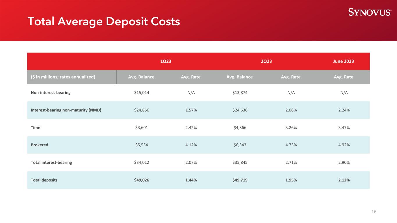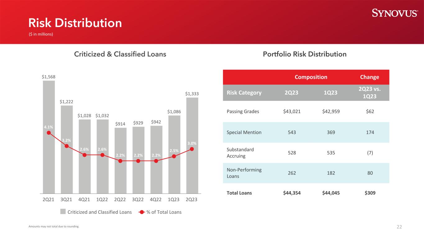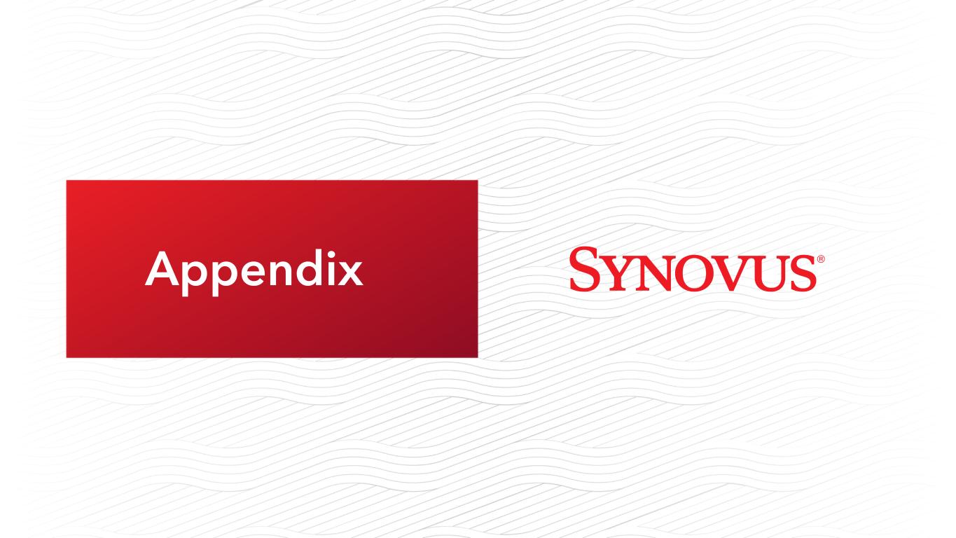 2本幻灯片演示文稿和我们向美国证券交易委员会提交的某些其他文件中包含的陈述构成“前瞻性陈述”,这些陈述属于经修订的1933年《证券法》第27A条和经修订的1934年《证券交易法》第21E条的含义,并受其保护。除历史事实陈述外,所有陈述均为前瞻性陈述。您可以通过Synovus使用诸如“相信”、“预期”、“预期”、“可能”、“将”、“假设”、“预测”、“可能”、“应该”、“将”、“打算”、“目标”、“估计”、“项目”、“计划”、“潜力”等类似的词语和表达方式来识别这些前瞻性陈述,这些词语和表达方式涉及Synovus未来业务和财务业绩的前景以及/或银行业和经济的总体表现。这些前瞻性陈述包括以下内容:(1)贷款增长;(2)存款增长、组合、定价和贝塔系数;(3)净利息收入和净息差;(4)收入增长;(5)非利息支出;(6)信贷趋势和关键信贷绩效指标;(7)我们的资本状况;(8)我们的或有流动性来源;(9)我们未来的运营和财务业绩;(10)我们未来收入增长、资产负债表管理、资本管理和费用管理的战略和举措;(11)我们的有效税率;以及(12)我们基于这些预期的假设。请潜在投资者注意,任何此类前瞻性陈述都不是对未来业绩的保证,并涉及已知和未知的风险和不确定性,这些风险和不确定性可能导致Synovus的实际结果、业绩或成就与此类前瞻性陈述所表达或暗示的未来结果、业绩或成就存在重大差异。前瞻性陈述基于Synovus管理层已知的信息以及当前的信念和期望,并受到重大风险和不确定性的影响。实际结果可能与这些前瞻性陈述所设想的结果大不相同。许多因素可能导致实际结果与本演示文稿中的前瞻性陈述所设想的结果大不相同。这些因素中有许多是Synovus无法控制或预测的。这些前瞻性陈述基于Synovus管理层目前已知的信息,具有内在的主观性、不确定性,并且可能会因各种风险和不确定性而发生变化,这些风险和不确定性包括但不限于Synovus提交给美国证券交易委员会的文件中列出的风险和其他因素,包括其截至2022年12月31日止年度的10-K表格年度报告,标题为“关于前瞻性陈述的警告通知”和“风险因素”,以及Synovus的10-Q表格季度报告和8-K表格当前报告。我们认为这些前瞻性陈述是合理的,但是,不应过分依赖任何前瞻性陈述,这些陈述是基于当前的预期,并且仅在做出这些陈述之日发表。我们不承担因新信息、未来发展或其他原因而更新任何前瞻性陈述的任何义务,除非法律另有规定。此幻灯片演示包含某些非GAAP财务指标,这些指标是根据公认会计原则以外的方法确定的。此类非公认会计原则财务指标包括:调整后的普通股股东可获得的净利润;调整后的稀释每股收益;调整后的平均资产回报率;平均有形普通股权益回报率;调整后的平均有形普通股权益回报率;调整后的非利息收入;调整后的收入;调整后的非利息支出;调整后的有形效率比率;以及有形普通股权益比率。与这些指标最具可比性的GAAP指标是:普通股股东可获得的净收入;每股摊薄收益;平均资产回报率;平均普通股权益回报率;非利息总收入;总收入;非利息支出总额;效率比率-TE;以及Synovus Financial Corp.股东权益与总资产的比率。管理层使用这些非公认会计准则财务指标来评估Synovus的业务表现和资本状况。管理层认为,这些非GAAP财务指标提供了有关Synovus的有意义的额外信息,以帮助管理层、投资者和银行监管机构评估Synovus的经营业绩、财务实力、业务表现和资本状况。然而, 这些非GAAP财务指标作为分析工具存在固有的局限性,不应孤立地考虑,也不应替代根据GAAP报告的经营业绩或资本状况分析。非GAAP财务指标应被视为我们的财务指标受重大项目和其他因素影响的方式的补充观点,并且由于它们不需要统一应用,它们可能无法与其他公司的其他类似名称的指标进行比较。调整后的普通股股东可获得的净收入、调整后的稀释每股收益和调整后的平均资产回报率是管理层用来评估经营业绩的衡量标准,但不包括不能表明正在进行的业务和影响期间比较的项目。平均有形普通股本回报率和调整后的平均有形普通股本回报率是管理层用来比较Synovus与其他金融机构业绩的衡量标准,因为它计算的是普通股股东可获得的回报,而不考虑无形资产及其相关摊销的影响,从而使管理层能够始终如一地评估企业的业绩。调整后的非利息收入和调整后的收入是管理层用来评估非利息收入和总收入(不包括投资证券净收益(损失)、不合格递延补偿的公允价值调整以及可能影响期间比较的其他项目)的衡量标准。调整后的非利息费用和调整后的有形效率比率是管理层用来衡量以减少经常性可控运营成本为重点的费用管理举措是否成功的衡量标准。管理层和银行监管机构使用有形普通股权益比率来评估我们的资本状况。此幻灯片演示中使用的非GAAP财务指标的计算在此幻灯片演示的附录中列出。如果管理层无法对调节项目提供有意义或准确的计算或估计,而且如果没有不合理的努力,就无法获得信息,则管理层不会为前瞻性的非公认会计原则财务措施提供调节。这是由于难以预测尚未发生、不在Synovus控制范围内或无法合理预测的各种项目的发生和财务影响。出于同样的原因,Synovus的管理层无法解决无法获得的信息可能带来的重大影响。在没有最直接可比的GAAP财务指标的情况下提供的前瞻