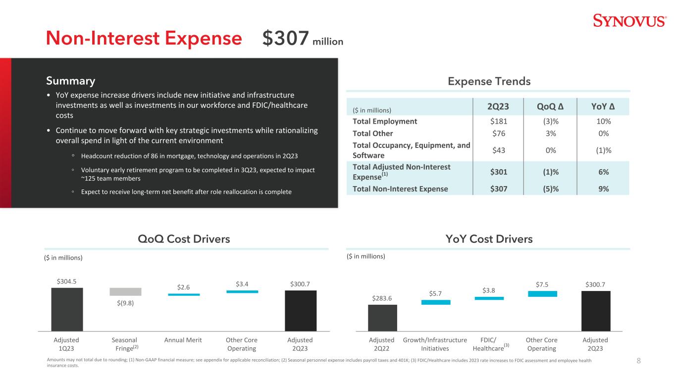 7 $ 139.4 $ 201.0核心客户费收入ex。抵押贷款(百万美元)2Q23 QoQ Ø YoY Ø Core Banking Fees(1)$ 472% 3% Wealth Revenue(2)$ 43(3)% 13% Capital Markets Income $ 7(49)%(6)% Net Mortgage Revenue $ 519% 18% Total Other Income(3)$ 9(2)% 60% Total Adjusted Non-Interest Revenue(4)$ 111(6)% 10% Total Non-Interest Revenue $ 112(16)% 15%由于四舍五入的关系,金额可能不在一起:(1)Include service charges on deposit accounts,card fees,letter of credit fees,ATM fees income,line of credit non-use fees,(3)包括权益法投资收益、BOLI收入和其他杂项收入;(4)非公认会计原则财务计量;适用的调节见附录。1.12亿美元5%的复合年增长率(9%的复合年增长率,不包括NSF/OD)(百万美元)非利息收入费用收入长期有机费用收入趋势•整体核心客户费用收入水平具有弹性,深厚的客户关系带来稳定的收入流的结果•费用收入环比下降,主要是由于2012年第一季度资本市场收入异常强劲•核心客户费用收入在过去4年中以接近两位数的速度增长,因为新产品和服务以及不断扩大的客户数量推动了更高水平的费用收入10%复合年增长率50.2美元14.1美元87.4美元20.7财富收入资本市场10%复合年增长率(3)15%复合年增长率75.0美元92.9核心银行费用56.7美元12.8美元80.1美元18.3美元摘要