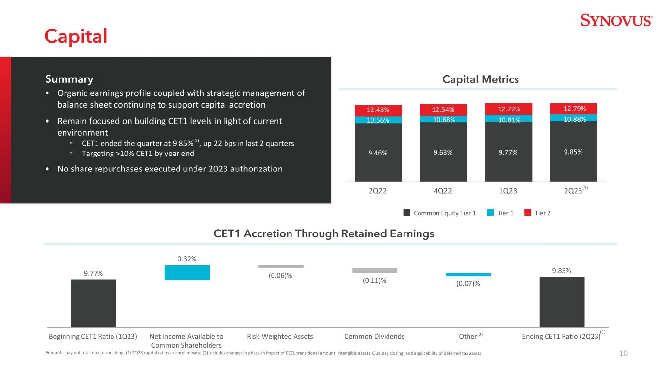 109.85% 9.77% 0.32%(0.06)%(0.11)%(0.07)%期初CET1比率(1Q23)普通股股东可得净收益风险加权资产普通股股息其他期末CET1比率(2Q23)由于四舍五入,金额可能不合计;(1)2Q23资本比率为初步;(2)包括CECL过渡金额、无形资产、Qualpay结算和递延所得税资产的适用性的阶段性影响变化。9.46% 9.63% 9.77% 9.85%普通股权一级一级二级2Q22 4Q22 1Q23 2Q23(1)12.43% 10.56% 10.81% 12.72% 12.79% 10.88%资本资本指标CET1通过留存收益增加•有机收益状况加上资产负债表的战略管理继续支持资本增加•鉴于当前环境,继续专注于提高CET1水平③ CET1在本季度结束时达到9.85%(1),在过去两个季度中上升22个基点③目标到年底CET1 > 10% •没有根据2023年授权执行股票回购(2)10.68% 12.54%(1)摘要