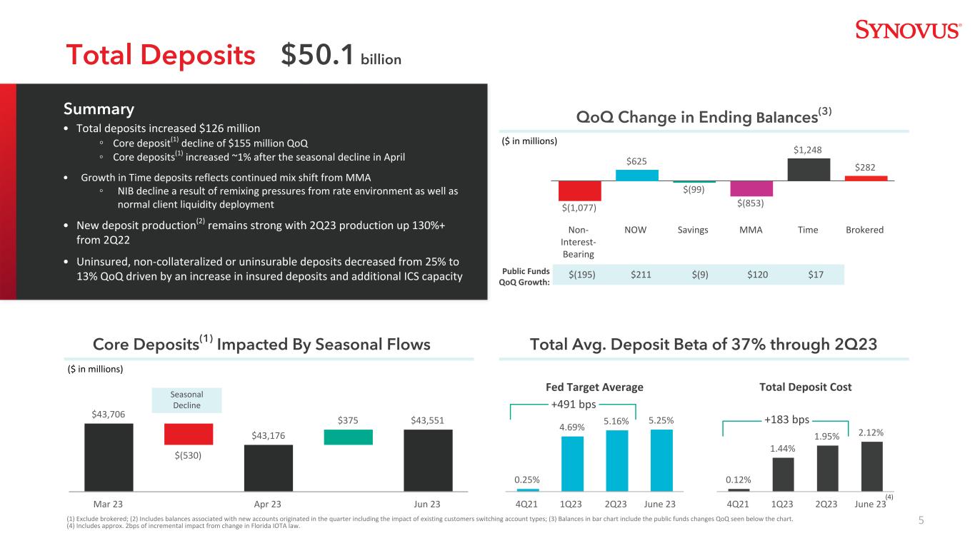 4 $ 44,354 $ 44,045 $ 297 $(69)$ 141 $(61)1Q23 CRE C & I Direct Consumer Third Party Consumer 2Q23 Total Loans Amounts may not total due to四舍五入;(1)Income producing real estate。•贷款总额环比增长3.09亿美元;主要是由CRE增长带动的,主要是为现有的多户家庭承诺提供资金的结果• C & I下降的原因是项目利用率下降(影响约3.5亿美元)和某些仅贷款银团的退出(影响约1.2亿美元)•新的和续贷的贷款生产侧重于核心关系①贷款生产,例如。Mortgage,down 46% from 2Q22 ③ Spreads to index on fled rate production约50 bps YoY • in July,退出Medical Office CRE业务线,并签订了出售13亿美元贷款组合的合同③尽管信贷质量尚可,但仍根据回报目标做出退出业务的战略决策③预计第三季度销售对净利润的负面影响约为2500万美元444亿美元期末贷款余额变化(百万美元)(百万美元)13,873美元14,289美元14,656美元15,18847.3% 48.6% 50.2% 47.7%承诺总额C & I额度利用率3Q22 4Q22 1Q23 2Q23总结贷款增长归属总额C & I循环承诺和额度利用率多样化/高质量贷款组合知识产权(1)1-4 Fam,Land & Dev. C & I Consumer Weighted Avg FICO of 77957.4% Weighted Avg LTV Diversified across multiple industries 2.3% 19.2% 27.7% 50.8%