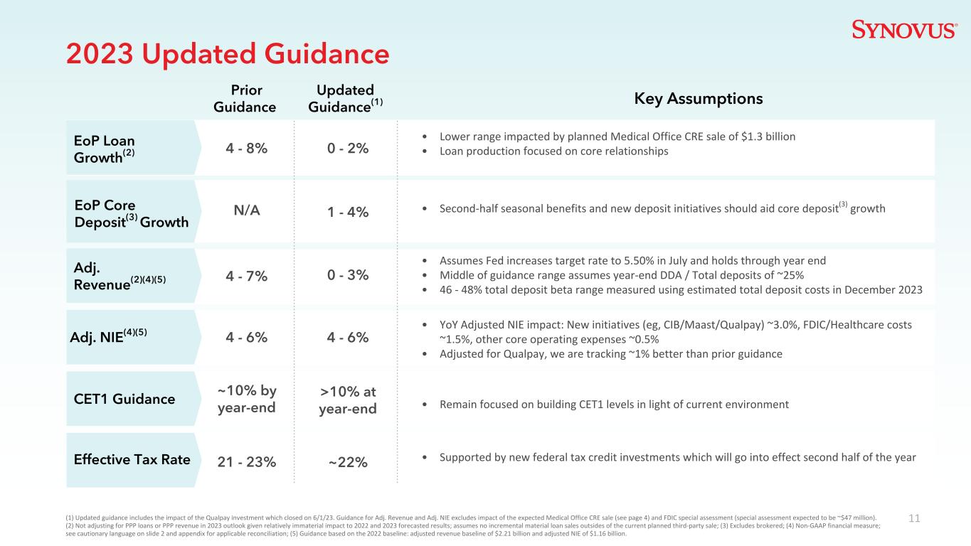 114-6%关键假设EoP贷款增长(2)EoP核心存款(3)增长调整收入(2)(4)(5)调整NIE(4)(5)有效税率CET1指导不适用4-7% 21-23%~10%年底前4-8%更新指导(1)(1)更新指导包括Qualpay投资的影响,该投资于6月1日结束。Adj. Revenue和Adj. NIE的指引不包括预期的Medical Office CRE销售(见第4页)和FDIC特别评估(特别评估预计约为4700万美元)的影响。(2)鉴于对2022年和2023年预测结果的影响相对较小,不对2023年的PPP贷款或PPP收入前景进行调整;假设在当前计划的第三方销售之外没有增加实质性贷款销售;(3)不包括中介;(4)非公认会计原则财务指标;有关适用的调节,请参见幻灯片2和附录中的警示性语言;(5)基于2022年基线的指导:调整后的收入基线为22.1亿美元,调整后的NIE为11.6亿美元。2023年更新指引先前指引年底0-2 % 1-4 % 0-3 % 4-6 %~22% > 10% •受计划出售的13亿美元医疗办公室CRE影响的较低幅度•贷款生产侧重于核心关系•下半年的季节性福利和新的存款举措应有助于核心存款(3)增长•假设美联储在7月将目标利率提高至5.50%并保持到年底•指引区间的中间假设年底DDA/存款总额约为25% • 46-48 %总存款贝塔区间使用2023年12月的估计存款总成本来衡量•同比调整后的NIE影响:新举措(例如,CIB/Maast/Qualpay)约为3.0%,FDIC/医疗保健成本约为1.5%,其他核心运营费用约为0.5% •根据Qualpay调整后,我们跟踪的数据比之前的指引高出约1% •继续专注于根据当前环境建立CET1水平•得到新的联邦税收抵免投资的支持,这些投资将于今年下半年生效