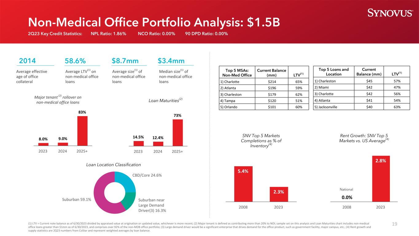 18商业地产构成2Q23 CRE投资组合总投资组合133亿美元投资地产土地、开发和住宅地产投资组合特点(截至6月30日,2023)办公楼多户购物中心酒店其他投资物业仓库住宅物业(1)开发和土地余额(以百万计)$ 3,032 $ 3,597 $ 1,329 $ 1,771 $ 1,471 $ 1,069 $ 616 $ 408加权平均LTV(2)61.3% 53.9% 57.5% 57.9% 54.5% 59.1% N/A N/A NPL Ratio 0.92% 0.05% 0.05% 0.05% 0.05% 0.05% 0.02% 0.68% 0.28% Net Charge-off Ratio(annualized)0.00% 0.00% 0.00 % 0.00 % 0.00 %(0.04)%(0.28)% 30 + Days Past Due Ratio 0.00% 0.00 % 0.01% 0.00 % 0.01% 0.22% 0.22% 0.14% 0.05% 90 + Days Past Due Ratio 0.00 % 0.00 % 0.00 % 0.00 % 0.00 % 0.00 % 0.00 % 0.00 % 0.00 %物业类型多样化程度较高•投资物业组合的信贷质量保持优异CRE信贷质量• 0.28%不良贷款比率•(0.01)%净销账比率(年化)• 0.03% 30 +天逾期比率• 0.00% 90 +天逾期比率由于四舍五入,金额可能不相加;(1)包括1-4个家庭建筑和1-4个家庭烫发/迷你烫发(主要是出租房屋);(2)LTV计算方法是将投资组合中非建筑部分的最近评估(通常在开始时)除以6/30/23承诺金额。1.5% 0.7% 1.9% 0.5%写字楼多户酒店购物中心其他投资物业仓库1-4家庭烫发/迷你烫发1-4家庭建筑住宅发展土地收购商业发展27.1% 10.0% 13.3% 11.1% 22.8% 8.0% 3.1%