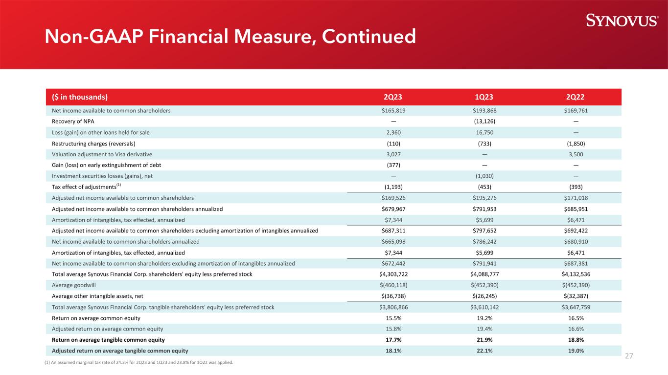 26(单位:千美元)2Q22 3Q22 4Q22 1Q23 2Q23净收益178,052美元203,044美元205,770美元202,159美元173,944收回不良资产————(13,126)——其他待售贷款的损失(收益)—— 16,7502,360重组费用(转回)(1,850)956(2,372)(733)(110)对Visa衍生品的估值调整3,500 — 2,500 — 3,027提前清偿债务的收益(损失)————(377)投资证券损失(收益),净额————(1,030)——调整的税收影响(1)(393)(228)(31)(453)(1,193)调整后的净收入179,309美元203,772美元205,867美元203,567美元177,651美元年化净收入714,165美元805,555美元816,370美元819,867美元697,687美元年化调整后的净收入719,206美元808,443美元816,755美元825,577美元712,556平均资产总额56,536,940美元58,055,979美元58,963,417美元60,133,561美元60,515,077平均资产回报率1.26% 1.39% 1.38% 1.36% 1.15%调整后的平均资产回报率1.27% 1.39% 1.39% 1.37% 1。Non-GAAP财务指标,续