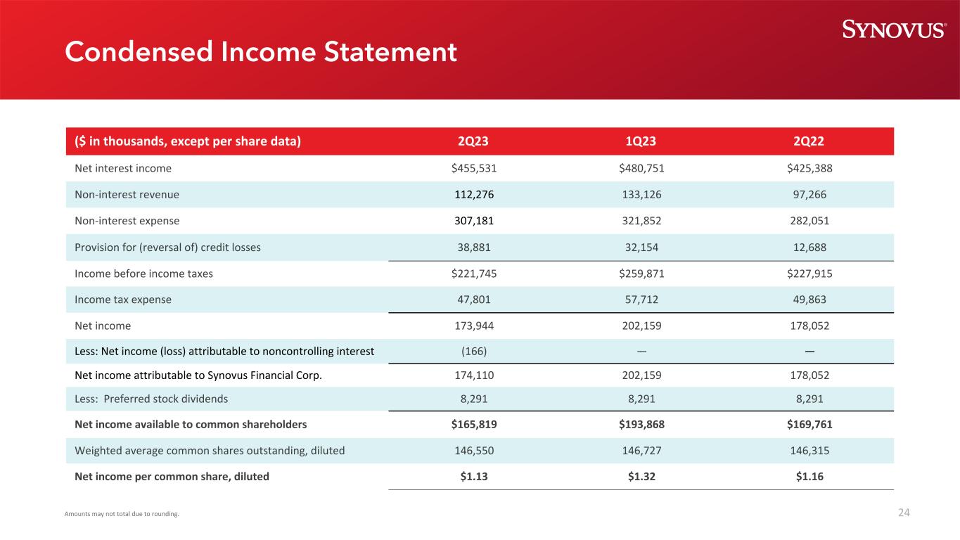 24(千美元,每股数据除外)2Q23 1Q23 2Q22净利息收入455,531美元480,751美元425,388美元非利息收入112,276133,12697,266非利息费用307,181321,852282,051信贷损失拨备(转回)38,88132,15412,688所得税前收入221,745美元259,871美元227,915所得税费用47,80157,71249,863净收入173,944202,159178,052减:归属于非控制性权益的净利润(亏损)(166)——归属于Synovus Financial Corp.的净利润174,110202,159178,052减:优先股股息8,2918,291普通股股东可获得的净利润165,819美元193,868美元稀释后146550146,727146,315每普通股净收入,稀释后1.13美元1.32美元1.16美元简明损益表由于四舍五入的关系,金额可能不在总数之内。