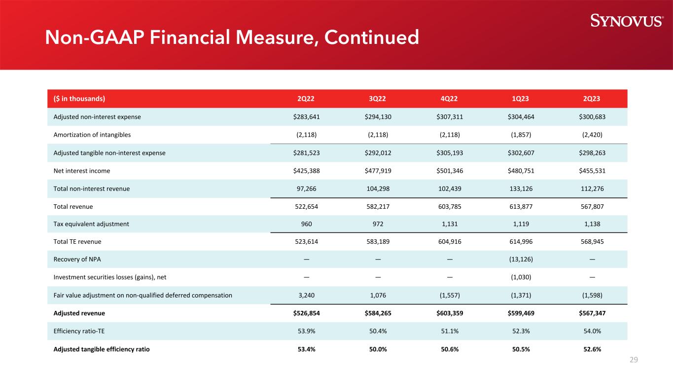 28非美国通用会计准则财务指标,续(千美元)2Q22 3Q22 4Q22 1Q23 2Q23非利息总收入97,266美元104,298美元102,439美元133,126美元112,276美元投资证券(收益)损失,净额————(1,030)——收回不良资产————(13,126)——不合格递延补偿的公允价值调整3,2401,076(1,557)(1,371)(1,598)调整后的非利息收入100,506美元105,374美元100,882美元117,599美元110,678非利息支出总额282,051美元294,010美元308,996美元321,852美元307,181持有的其他贷款损失出售————(16,750)(2,360)重组(费用)转回1,850(956)2,372733110非合格递延补偿的公允价值调整3,2401,076(1,557)(1,371)(1,598)对Visa衍生工具的估值调整(3,500)—(2,500)—(3,027)提前清偿债务的收益(损失)———— 377调整后的非利息费用283,641美元294,130美元307,311美元304,464美元300683美元