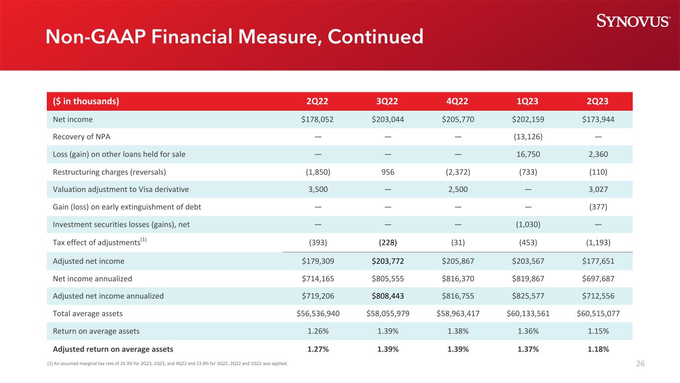 25(千美元,每股数据除外)2Q23 1Q23 2Q22普通股股东可获得的净收入165,819美元193,868美元169,761美元收回不良资产——(13,126)——投资证券损失(收益),净额——(1,030)——持有待售的其他贷款的损失(收益)2,36016,750 ——重组费用(转回)(110)(733)(1,850)(收益)债务提前清偿损失(377)——对Visa衍生工具的估值调整3,027 ——(3,500)调整的税收影响(1)(1,193)(453)(393)普通股股东可获得的调整后净利润169,526美元195,276美元171,018美元加权平均已发行普通股,稀释后每股净收益146,550146,727146,315,稀释后每股净收益1.13美元1.32美元1.16调整后每股净收益,稀释后每股净收益1.16美元1.33美元1.17美元(1)2Q23和1Q23的假定边际税率为24.3%,1Q22的假定边际税率为23.8%。非公认会计原则财务措施