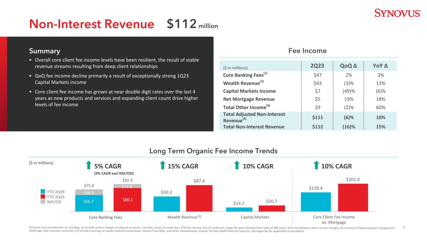 6 $ 425 $ 478 $ 501 $ 481 $ 4563.22% 3.47% 3.56% 3.43% 3.20%净利息收入净息差2Q22 3Q22 4Q22 1Q23 2Q23 3.20% 3.43% 0.21% 0.02%(0.30)%(0.05)%(0.04)% 1Q23贷款收益率其他收益资产IB存款成本NIB Remix Whsl/Brok Cost 2Q23(百万美元)由于四舍五入,金额可能不在一起;(1)NIM反映实际/实际天数,包括与先前报告的NIM相比的其他非实质性调整;(2)估计影响;(3)截至2Q23的平均投资组合收益率;(4)相关市场利率和/或近期Synovus发起的估计。4.56亿美元净利息收入NII/NIM趋势长期NII催化剂NIM瀑布(2)• NII增长3000万美元,同比增长7%;环比下降2500万美元,同比下降5% •较高的资产收益率和盈利资产增长带来的好处被存款成本的持续上升和NIB存款的负混合所抵消•浮动利率贷款占贷款总额的比例为63%,高于2Q22的60% • 300 +亿美元的固定利率名义重新定价总额将在更长时间的更高环境中为NII/NIM提供更长期的顺风更包括约110亿美元的固定利率贷款(不包括抵押贷款),期限约为2年(1)名义(B美元)估计平均期限。投资组合收益率(3)流动利率(4)证券$ 11.2 5.4Y 2.16%~5.0-5.5%抵押贷款$ 5.4 5.1Y 3.67%~6.0-7.0%其他固定利率贷款$ 10.9 2.3Y 4.87%~6.5-7.5%贷款对冲投资组合$ 4.3 2.2Y 1.82%~5.25%固定利率重新定价摘要