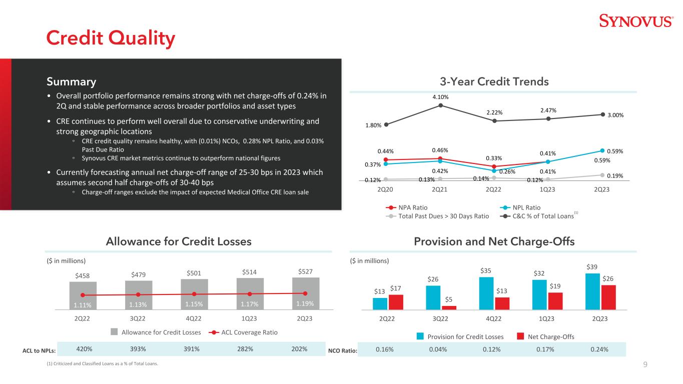 9 $ 458 $ 479 $ 501 $ 514 $ 5271.11% 1.13% 1.15% 1.17% 1.19%信贷损失准备金ACL Coverage Ratio 2Q22 3Q22 4Q22 1Q23 2Q23 0.44% 0.46% 0.33% 0.41% 0.59% 0.37% 0.42% 0.26% 0.41% 0.59% 0.12% 0.14% 0.12% 0.19% NPA Ratio NPL Ratio Total Past Due > 30 Days Ratio C & C % of Total Loans 2Q20 2Q21 2Q22 1Q23 2Q23 $ 13 $ 26 $ 35 $ 32 $ 39 $ 17 $ 5 $ 13 $ 19 $ 26 Provision信用损失净销账2Q22 3Q22 4Q22 1Q23 2Q23(百万美元)(百万美元)0.16% 0.04% 0.12% 0.17% 0.24% NCO比率:420% 393% 391% 282% 202% ACL与不良贷款:信用质量信用质量3年信用趋势信用损失准备金和净销账•整体投资组合表现强劲,第二季度净销账为0.24%,更广泛的投资组合和资产类型表现稳定•由于保守的承保和强大的地理位置,CRE继续整体表现良好① CRE信用质量保持健康,NCO为(0.01%),不良贷款率为0.28%,和0.03%的逾期未偿还比率③ Synovus CRE市场指标继续优于国家数据•目前预测2023年的年度净冲销范围为25-30个基点,假设下半年冲销为30-40个基点③冲销范围不包括预期的医疗办公室CRE贷款销售的影响(1)(1)批评和分类贷款占总贷款的百分比。1.80% 4.10% 2.22% 2.47% 3.00%摘要