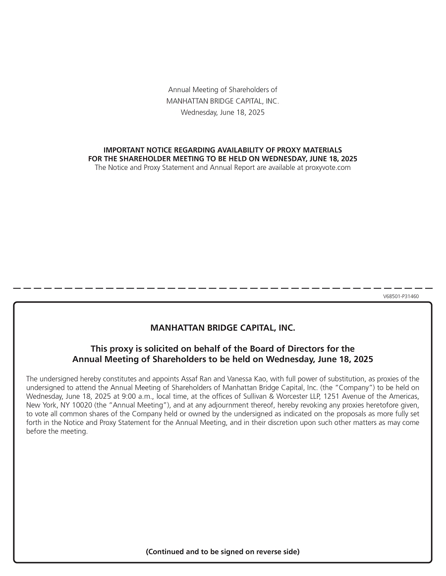 Manhattan Bridge Capital, Inc.(“公司”)年度股东大会将于当地时间2025年6月18日(星期三)上午9:00在Sullivan & Worcester LLP,1251 Avenue of the Americas,New York,NY 10020的办公室举行,目的是审议并就以下事项采取行动: