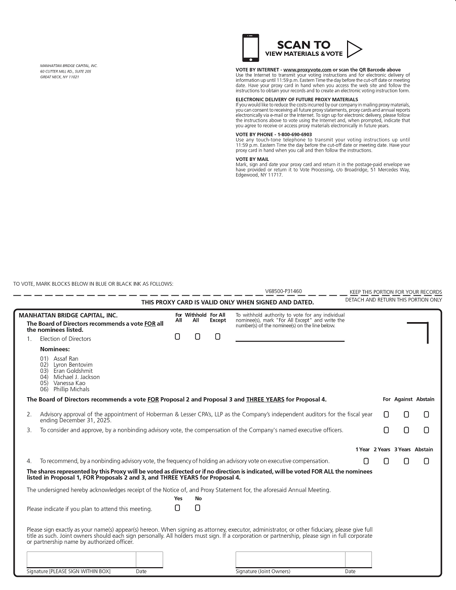 年会的代理材料,包括我们给股东的年度报告和代理声明是 可查阅http://www.manhattanbridgecapital.com/meeting.php |