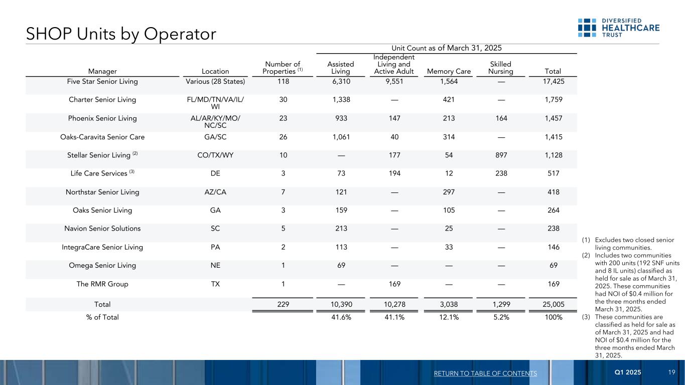 2025年第一季度19家按运营商划分的商店单位返回目录截至3月31日的单位数量,2025经理位置物业数目(1)辅助生活医疗独立生活和活跃的成人记忆护理熟练护理总计五星老年生活各种(28个州)1186,3109,5511,564 — 17,425 Charter Senior Living FL/MD/TN/VA/IL/WI 301,338 — 421 — 1,759 Phoenix Senior Living AL/AR/KY/MO/NC/SC 239331472131641,457 Oaks-Caravita Senior Care GA/SC 261,06140314 — 1,415 Stellar Senior Living(2)CO/TX/WY 10 — 177548971,128 Life Care Services(3)DE37319412238517 Northstar Senior Living AZ/加利福尼亚州 7121 — 297 — 418 Oaks Senior Living GA 3 159 — 105 — 264213 — 25 — 238 IntegraCare Senior Living PA 2 113 — 33 — 146 Omega Senior Living NE 169 ———— 69 The RMR Group TX 1 — 169 —— 169合计22910,39010,2783,0381,29925,005%合计41.6% 41.1% 12.1% 5.2% 100%(1)不包括两个封闭式养老生活社区。(2)包括截至2025年3月31日分类为持有待售的200个单位(192个SNF单位和8个IL单位)的两个社区。截至2025年3月31日的三个月,这些社区的NOI为40万美元。(3)截至2025年3月31日,这些社区被归类为持有待售,截至2025年3月31日止三个月的NOI为0.4百万美元。