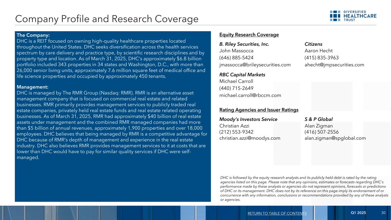 2025年第一季度30公司:DHC是一家专注于拥有位于美国各地的优质医疗保健物业的房地产投资信托基金。DHC通过护理提供和实践类型、科学研究学科以及财产类型和位置,在整个健康服务范围内寻求多样化。截至2025年3月31日,DHC约68亿美元的投资组合包括位于34个州和华盛顿特区的343处房产,拥有超过2.6万个高级生活单元、约760万平方英尺的医疗办公和生命科学物业,约有450名租户。管理层:DHC由The RMR Group(RMR)管理。RMR是一家专注于商业地产及相关业务的另类资产管理公司。RMR主要向上市房地产公司、私募持有的房地产基金及房地产相关经营业务提供管理服务。截至2025年3月31日,RMR管理着约400亿美元的房地产资产,RMR管理的公司合并后的年收入超过50亿美元,拥有约1900处房产和超过18000名员工。DHC认为,由于RMR在房地产行业的管理深度和经验,由RMR管理对DHC来说是一种竞争优势。DHC还认为,RMR向其提供管理服务的成本低于如果DHC是自我管理的,TERM3将低于DHC为类似质量服务所必须支付的费用。公司简介和研究覆盖范围恢复到目录股票研究覆盖范围B. Riley Securities,Inc. Citizens John Massocca Aaron Hecht(646)885-5424(415)835-3963 jmassocca@brileysecurities.com ahecht@jmpsecurities.com加拿大皇家银行资本市场丨Michael Carroll Michael Carroll(440)715-2649 michael.carroll@rbccm.com评级机构和发行人评级穆迪投资者服务公司标普全球 Christian Azzi Alan Zigman(212)553-9342(416)507-2556 christian.azzi@moodys.com alan.zigman@spglobal.com DHC之后是股票研究请注意,这些分析师或机构对DHC的业绩所作的任何意见、估计或预测,并不代表DHC或其管理层的意见、预测或预测。DHC在此页面上的引用并不意味着其认可或同意任何这些分析师或机构提供的任何信息、结论或建议。