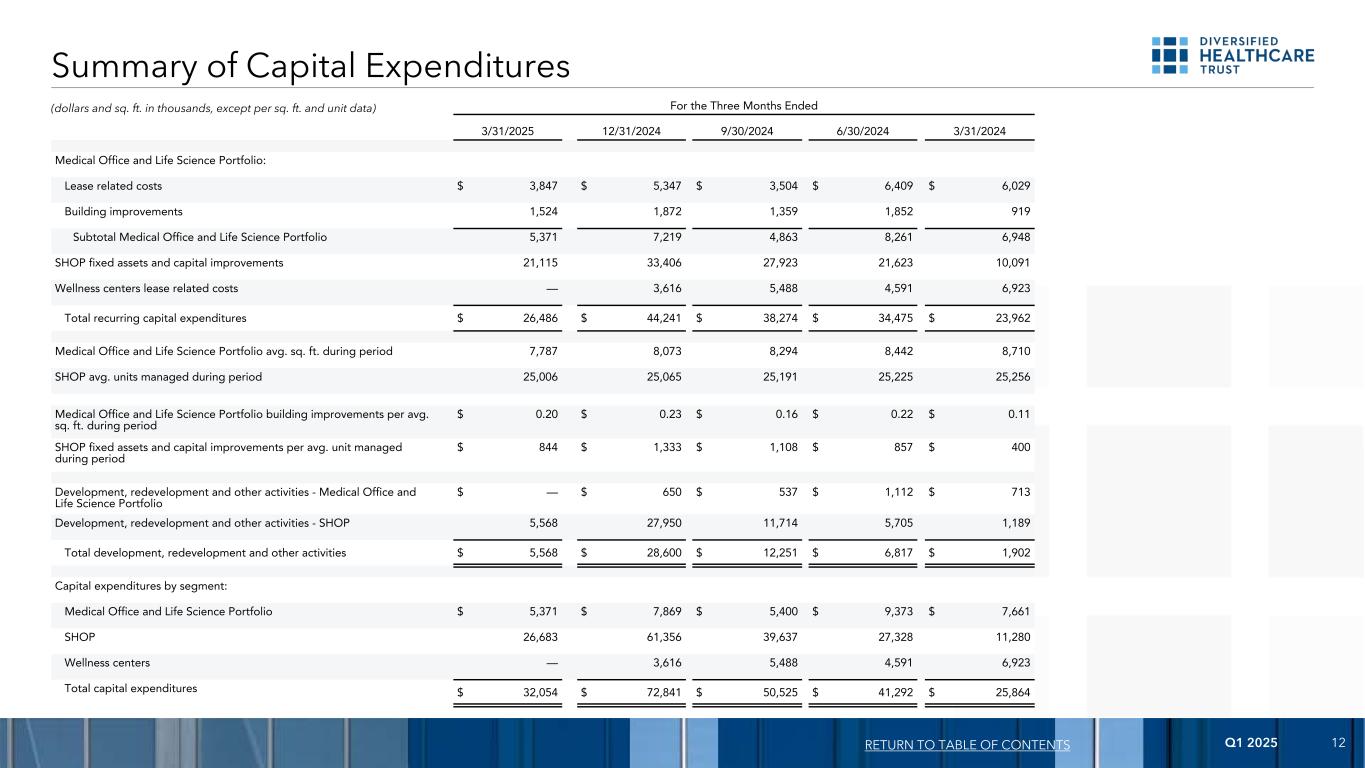 2025年第一季度12(美元和平方英尺,单位:千,每平方英尺和单位数据除外)截至3/31/202512/31/20249/30/20246/30/20243/31/2024医疗办公室和生命科学组合:租赁相关成本3,847美元5,347美元3,504美元6,409美元6,029美元建筑改善1,5241,8721,3591,852919医疗办公室和生命科学组合小计5,3717,2194,8638,2616,948商店固定资产和资本改善21,11533,40627,92321,62310,091健康中心租赁相关成本— 3,6165,4884,5916,923经常性资本支出总额26,486美元44,241美元38,274美元34,475美元23,962美元期间医疗办公室和生命科学组合平均平方英尺7,7878,0738,2948,4428,710个在期间管理的平均单位25,00625,06525,19125,22525,256个医疗办公室和生命科学组合建筑改善期间平均每平方英尺0.20美元0.23美元0.16美元0.22美元0.11美元商店固定资产期间管理的每单位平均资本改进844美元1333美元1108美元857美元400美元开发、再开发和其他活动-医疗办公室和生命科学组合$ — 650美元537美元1,112美元713美元开发、再开发和其他活动-商店5,56827,95011,7145,7051,189开发总额,重建和其他活动$ 5,568 $ 28,600 $ 12,251 $ 6,817 $ 1,902按部门分列的资本支出:医疗办公室和生命科学组合$ 5,371 $ 7,869 $ 5,400 $ 9,373 $ 7,661商店26,68361,35639,63727,32811,280健康中心— 3,6165,4884,5916,923总资本支出$ 32,054 $ 72,841 $ 50,525 $ 41,292 $ 25,864