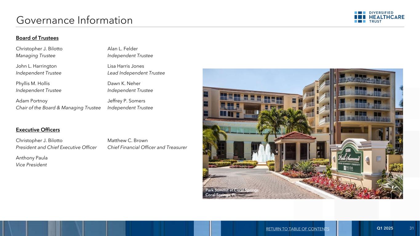 2025年第一季度31届董事会Christopher J. Bilotto Alan L. Felder管理受托人独立受托人John L. HarringtonLisa Harris Jones独立受托人首席独立受托人Phyllis M. Hollis Dawn K. Neher独立受托人独立受托人Adam Portnoy Jeffrey P. Somers董事会主席兼管理受托人独立受托人执行官Christopher J. Bilotto 首席财务官总裁兼首席执行官和财务主管Anthony Paula治理信息副总裁返回佛罗里达州珊瑚泉珊瑚泉举行的目录公园峰会