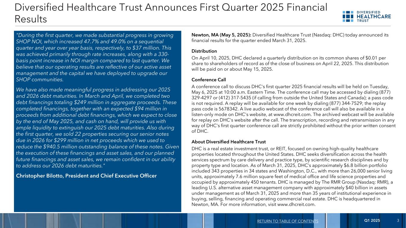 2025年第一季度3 "在第一季度,我们在增加SHOP NOI方面取得了实质性进展,环比和同比分别增长47.7%和49.0%,达到3700万美元。这主要是通过加息实现的,同时与上一季度相比,NOI利润率提高了330个基点。我们相信,我们的经营业绩反映了我们积极的资产管理以及我们为升级SHOP社区而部署的资本。我们在解决2025年和2026年债务到期问题方面也取得了有意义的进展。在3月和4月,我们完成了两笔债务融资,总收益为2.49亿美元。这些已完成的融资,加上我们预计将在2025年5月底完成的额外债务融资的预期收益9400万美元,以及手头现金,将为我们提供充足的流动性,以消除我们2025年到期的债务。同样在第一季度,我们以2.99亿美元的净收益出售了22处为2026年到期的优先票据提供担保的房产,我们用这些净收益来减少这些票据的9.405亿美元未偿余额。鉴于这些融资和资产出售的执行情况,以及我们计划的未来融资和资产出售,我们仍然对解决2026年债务到期问题的能力充满信心。”Diversified Healthcare Trust总裁兼首席执行官Christopher Bilotto公布2025年第一季度财务业绩返回目录马萨诸塞州牛顿市(2025年5月5日):Diversified Healthcare Trust(纳斯达克)今天公布了截至2025年3月31日的季度财务业绩。于2025年4月10日进行分配,DHC宣布向截至2025年4月22日收盘时在册的股东进行每股0.01美元的普通股季度分配。本次分派将于2025年5月15日或前后支付。电话会议讨论DHC 2025年第一季度财务业绩的电话会议将于美国东部时间2025年5月6日(星期二)上午10:00举行。电话会议可拨打(877)329-4297或(412)317-5435(如果从美国和加拿大境外拨打);不需要密码。回放一周可拨打(877)344-7529;回放密码5678342。电话会议的现场音频网络广播也将在DHC的网站www.dhcreit.com上以只听模式提供。电话会议结束后,已归档的网络广播将可在DHC的网站上重播。未经DHC事先书面同意,严禁对DHC第一季度电话会议进行任何形式的转录、录音和转播。关于Diversified Healthcare TrustDHC是一家房地产投资信托基金,简称REIT,专注于拥有位于美国各地的优质医疗保健物业。DHC通过护理提供和实践类型、科研学科以及财产类型和位置,在整个健康服务范围内寻求多样化。截至2025年3月31日,DHC约68亿美元的投资组合包括位于34个州和华盛顿特区的343处房产,拥有超过2.6万个高级生活单元、约760万平方英尺的医疗办公和生命科学物业,约有450名租户。DHC由The RMR Group(纳斯达克:RMR)管理,该公司是美国领先的另类资产管理公司,截至2025年3月31日,其管理的资产约为400亿美元,在购买、销售、融资和运营商业房地产方面拥有超过35年的机构经验。DHC总部位于马萨诸塞州牛顿市。欲了解更多信息,请访问www.dhcreit.com。