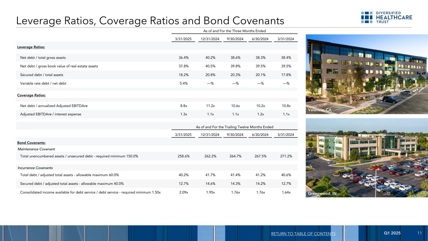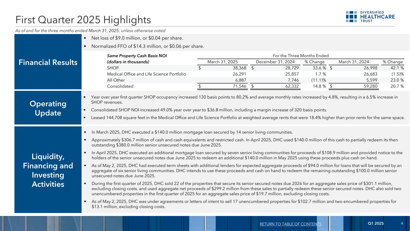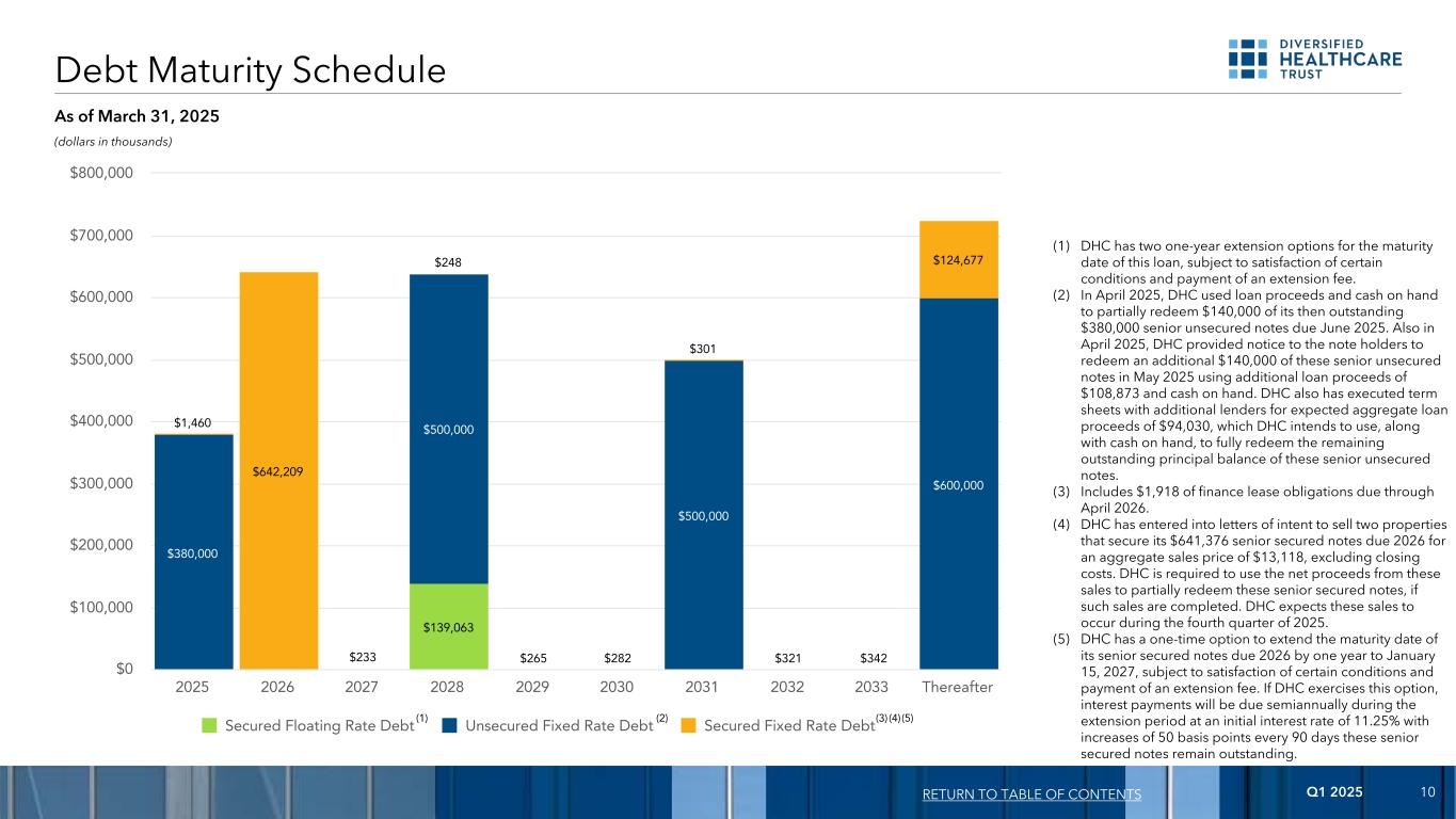 2025年第一季度10美元139,063美元380,000美元500,000美元500,000美元600,000美元1,460美元642,209美元233美元248美元265美元282美元301美元321美元342美元124,677美元有担保浮动利率债务无担保固定利率债务有担保固定利率债务202520262027202820292030203120322033此后0美元100,000美元200,000美元300,000美元400,000美元500,000美元600,000美元700,000美元800,000美元债务到期时间表(3)返回目录(单位:千美元)截至2025年3月31日(1)DHC对这笔贷款的到期日有两个为期一年的延期选择,但须满足某些条件并支付延期费用。(2)2025年4月,DHC使用贷款收益和手头现金部分赎回了其当时未偿还的38万美元于2025年6月到期的高级无抵押票据中的14万美元。同样在2025年4月,DHC向票据持有人发出通知,要求他们在2025年5月使用额外的贷款收益108873美元和手头现金赎回额外的140,000美元这些高级无担保票据。DHC还与其他贷方执行了条款清单,预计贷款收益总额为94030美元,DHC打算将其与手头现金一起用于全额赎回这些优先无担保票据的剩余未偿本金余额。(3)包括截至2026年4月到期的1918美元融资租赁债务。(4)DHC已签订意向书,出售两处房产,为其2026年到期的641376美元优先有担保票据提供担保,总销售价格为13118美元,不包括成交费用。如果出售完成,DHC需将这些出售的净收益用于部分赎回这些优先有担保票据。DHC预计这些销售将在2025年第四季度发生。(5)在满足某些条件并支付延期费用的情况下,DHC拥有将其2026年到期的优先有担保票据的到期日延长一年至2027年1月15日的一次性选择权。如果DHC行使这一选择权,则在延长期内将每半年支付一次利息,初始利率为11.25%,每90天加息50个基点,这些未偿还的优先有担保票据。(4) (5) (1) (2)