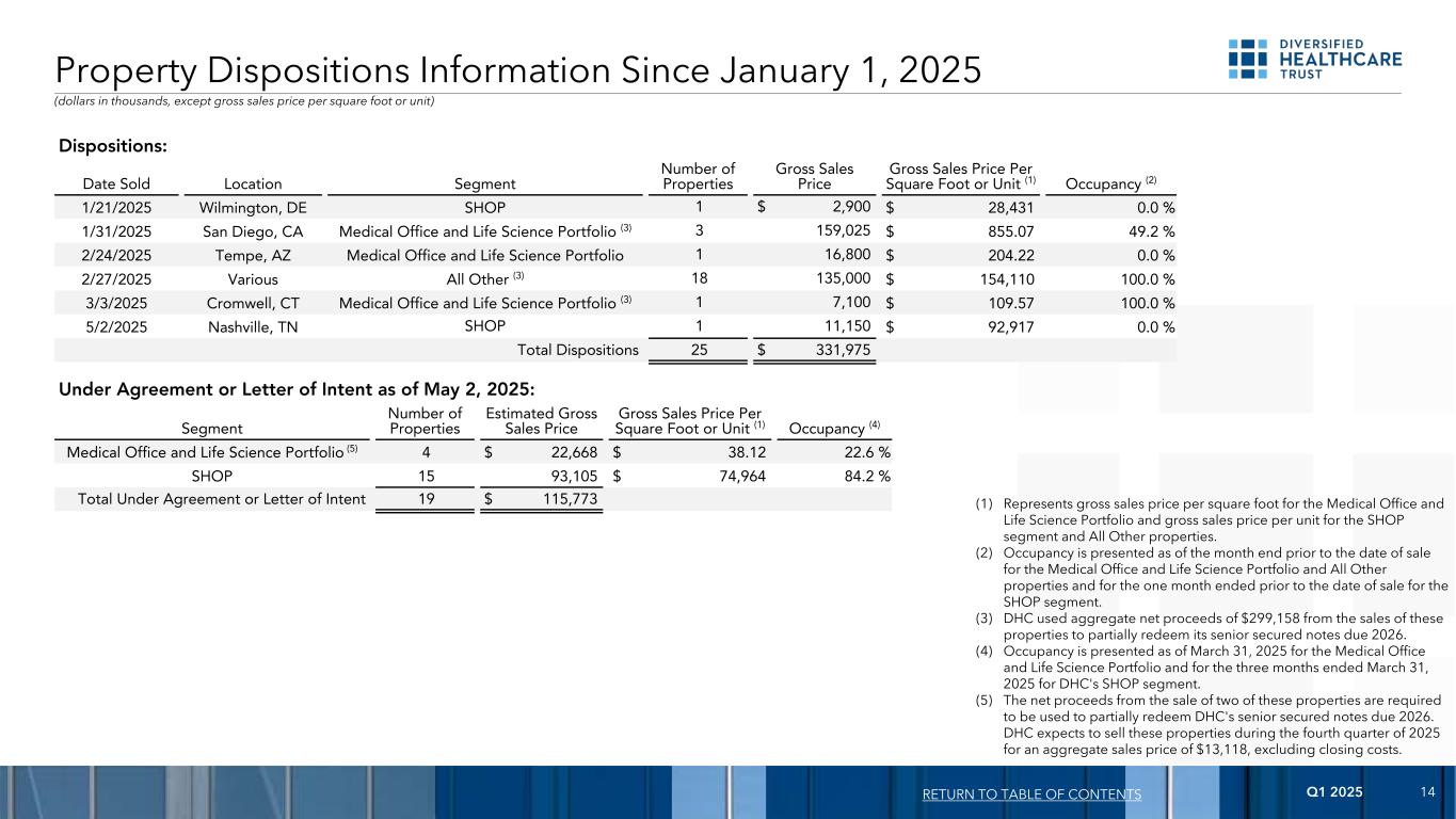 2025年第一季度14项物业处置信息自2025年1月1日起处置:出售日期位置段物业数量毛销价每平方英尺或单位毛销价(1)占用(2)1/21/2025 Wilmington,DE SHOP 1 $ 2,900 $ 28,4310.0% 1/31/2025 San Diego,加利福尼亚州 Medical Office and Life Science Portfolio(3)3159,025 $ 855.07 49.2% 2/24/2025 Tempe,AZ Medical Office and Life Science Portfolio 116,800 $ 204.22 0.0% 2/27/2025 Various All Other(3)18135,000 $ 154,110100.0% 3/3/2025 Cromwell,CT Medical Office and Life Science Portfolio(3)17,100 $ 109.57 100.0% 5/2/2025 Nashville,TN SHOP 1 11,150 $ 92,9170.0%总处置25331,975美元目录回报(以千美元计,每平方英尺或单位的总销售价格除外)(1)表示Medical Office and Life Science Portfolio的每平方英尺总销售价格以及SHOP部门和所有其他物业的每单位总销售价格。(2)入住率呈列截至医疗办公室和生命科学组合及所有其他物业出售日期前的月底,以及截至SHOP分部出售日期前一个月的入住率。(3)DHC使用出售这些物业的总收益净额299158美元来部分赎回其2026年到期的优先有担保票据。(4)入住率显示的是截至2025年3月31日的医疗办公室和生命科学产品组合,以及截至2025年3月31日止三个月的DHC商店部分。(5)出售其中两处物业的所得款项净额须用于部分赎回DHC于2026年到期的优先有担保票据。DHC预计将在2025年第四季度出售这些物业,总销售价格为13118美元,不包括关闭费用。根据截至2025年5月2日的协议或意向书:物业分部数量估计总销售价格每平方英尺或单位的总销售价格(1)占用(4)医疗办公室和生命科学组合(5)4 $ 22,668 $ 38.12 22.6%商店1593,105 $ 74,96484.2%根据协议或意向书总计19 $ 115,773