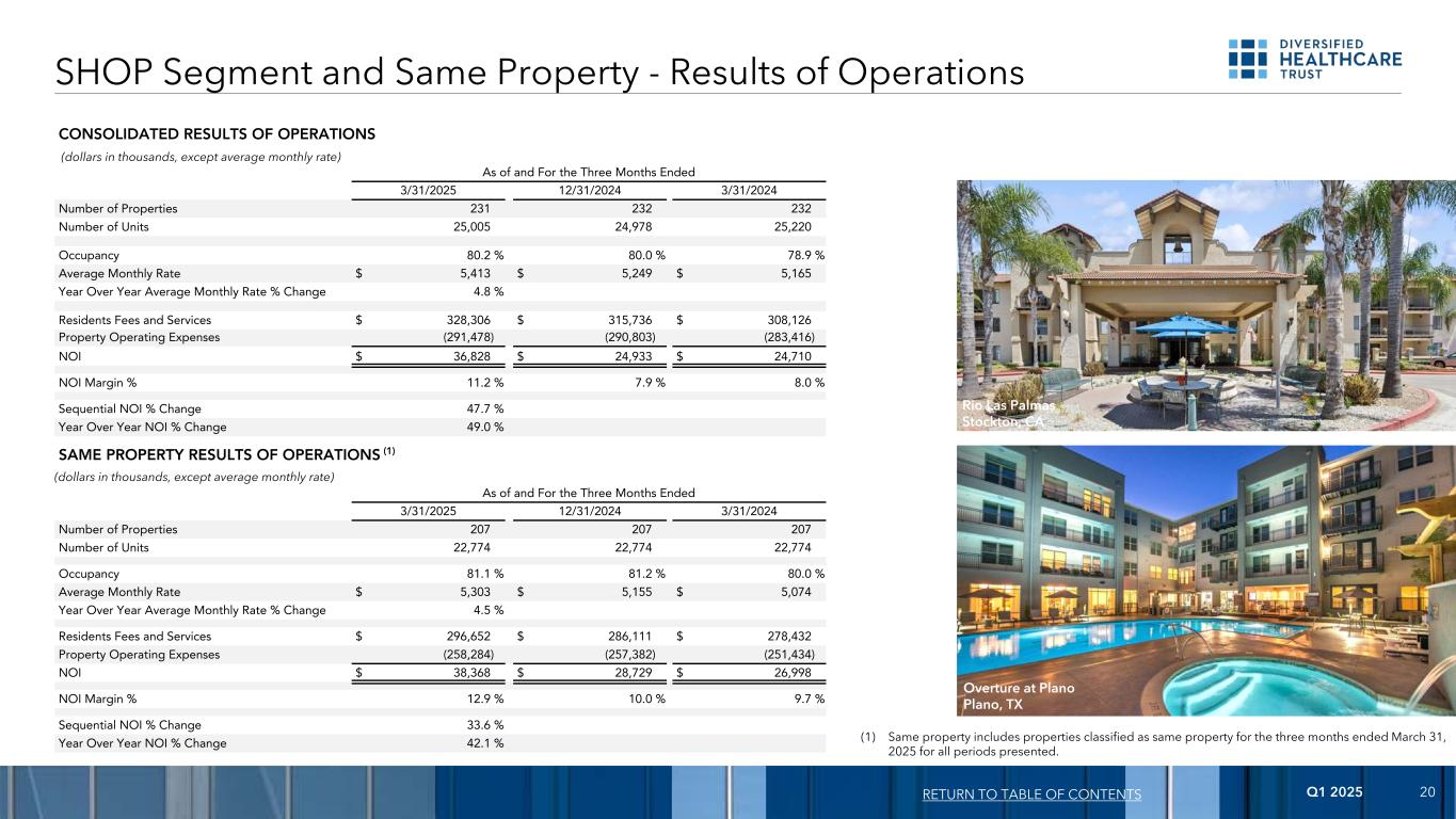 2025年第一季度20个店铺分部和同一物业-经营业绩返回目录截至2025年3月31日止三个月的综合经营业绩12/31/20243/31/2024物业数量231223232单位数量25,00524,97825,220入住率80.2% 80.0% 78.9%平均月费率$ 5,413 $ 5,249 $ 5,165同比平均月费率变动% 4.8%居民费和服务328,306美元315,736美元308,126美元物业运营费用(291,478)(290,803)(283,416)NOI 36,828美元24,933美元24,710美元NOI保证金% 11.2% 7.9% 8.0%连续NOI %变化47.7%同比NOI %变化49.0%相同物业运营结果(1)截至及截至2025年3月31日止三个月12/31/20243/31/2024物业数目207207207单位数22,77422,77422,774入住率81.1% 81.2% 80.0%平均月费$ 5,303 $ 5,155 $ 5,074同比平均月率%变动% 4.5%居民费用和服务$ 296,652 $ 286,111 $ 278,432物业运营费用(258,284)(257,382)(251,434)NOI $ 38,368 $ 28,729 $ 26,998 NOI Margin % 12.9% 10.0% 9.7% Sequential NOI % Change 33.6% Year over Year NOI % Change 42.1%(1)Same property includes properties classified as the same property for the three ends of March 31,2025,257,382)(257,382)NOI margin % 12.9% 10.0% 9.7% sequent(单位:千美元,平均月费除外)(单位:千美元,平均月费除外)Rio Las Palmas Stockton,加利福尼亚州 Overture at Plano Plano,TX