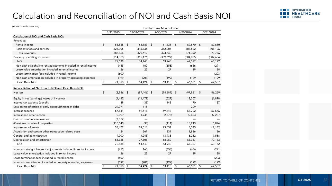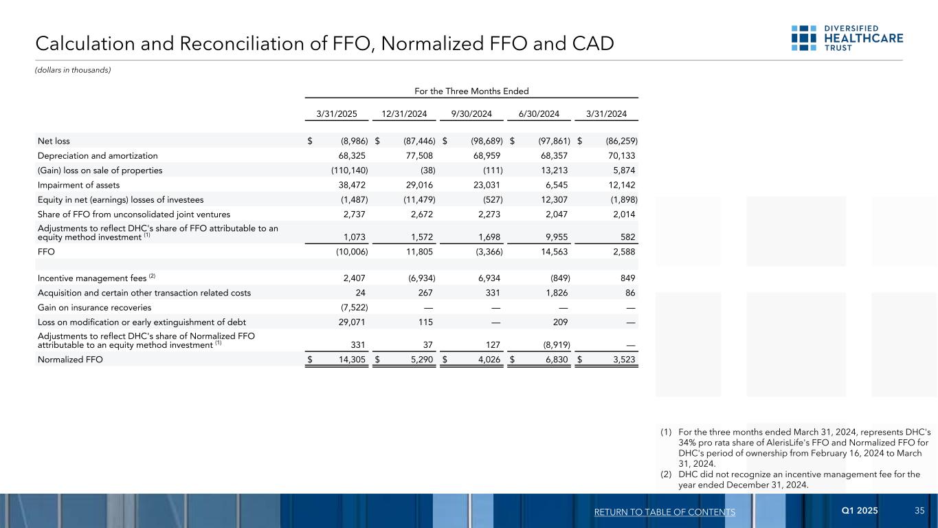 2025年第一季度34 EBITDA的计算和调节,截至3/31/202512/31/20249/30/20246/30/20243/31/2024净亏损$(8,986)$(87,446)$(98,689)$(97,861)$(86,259)利息费用57,83159,51859,44358,70257,576所得税费用(收益)49(38)148170187折旧及摊销68,32577,50868,95968,35770,133 EBITDA 117,21949,54229,86129,36841,637(收益)出售物业亏损(110,140)(38)(111)13,2135,874资产减值38,47229,01623,0316,54512,142被投资单位净(收益)亏损中的权益(1,487)(11,479)(527)12,307(1,898)应占EBITDA来自未合并的合营企业4,4944,5154,1173,8723,838,838调整以反映DHC应占EBITDA应占权益法投资(1)1,5891,6792,22213,2821,047 EBITDA为50,14773,23558,59378,587和以普通股支付的管理费用592324925940558激励管理费(2)2,407(6,934)6,934(849)849收购以及某些其他与交易相关的成本242673311,82686保险追偿收益(7,522)————债务的修改或提前清偿损失29,071115 — 209 —调整以反映DHC在调整后EBITDA中所占份额归属于权益法投资(1)3904234(11,818)(73)调整后EBITDA为75,109美元67,049美元66,817美元68,895美元64,060美元截至2024年3月31日止三个月的目录(1)中的回报,代表DHC按比例在DHC的归属期自2月16日起的AlerisLife的EBITDA和调整后EBITDA中所占的34%,2024年至2024年3月31日。(2)DHC未确认截至2024年12月31日止年度的激励管理费。