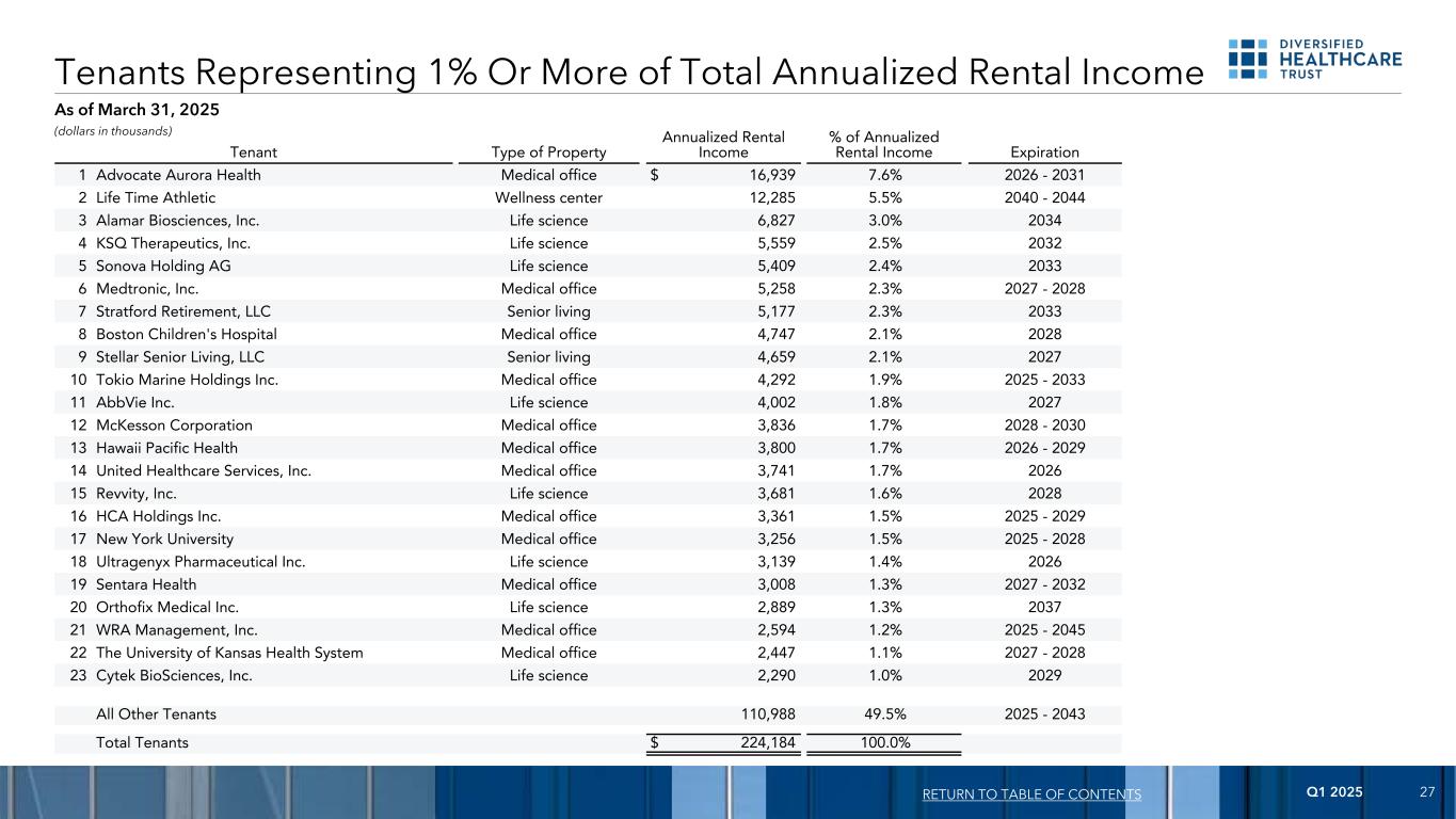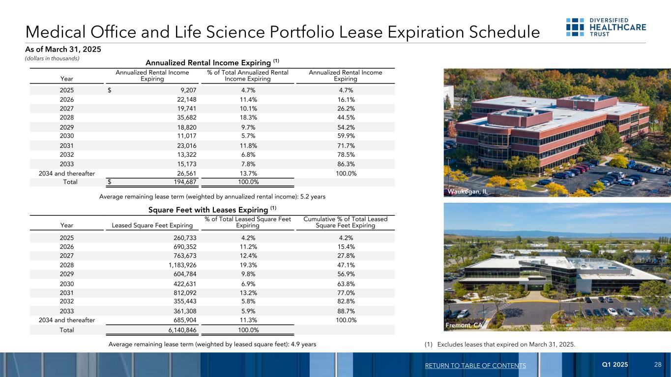 2025年第一季度27截至2025年3月31日,占年化租金收入总额1%或以上的租户向目录的回报(单位:千美元)租户物业类型年化租金收入占年化租金收入的百分比到期1 Advocate Aurora Health Medical Office $ 16,9397.6% 2026-2031 2 Life Time Athletic Wellness Center 12,2855.5% 2040-2044 3 Alamar Biosciences,Inc. Life Science 6,8273.0% 2034 4 KSQTherapeutics,Inc. Life Science 5,559 2.5% 20325 Sonova Holding AG Life Science 5,4092.4% 20336 美敦力,Inc. Medical Office 5,2582.3% 2027-20287 Stratford Retirement,LLC Senior Living 5,1772.3% 20338 Boston Children's Hospital Medical Office 4,7472.1% 20289 Stellar Senior Living,LLC Senior Living 4,6592.1% 202710 Tokio Marine Holdings Inc. Medical Office 4,2921.9% 2025-203311 AbbVie Inc. Life Science 4,0021.8% 202712 McKesson Corporation Medical Office 3,8361.7% 2028-203013 Hawaii Pacific Health Medical Office 3,8361.7% 2026-202914 United Healthcare Services,Inc. Medical Office 3,7411.7% 202615 Revvity,Inc.生命科学3,6811.6% 202816 HCA Holdings Inc.医疗办公室3,3611.5% 2025-202917纽约大学医疗办公室3,2561.5% 2025-202818丨Ultragenyx Pharmaceutical Inc. Ultragenyx Pharmaceutical Inc. Life Science 3,1391.4% 202619 Sentara Health Medical Office 3,0081.3% 2027-203220 Orthofix Medical Inc.丨生命科学2,8891.3% 203721 WRA Management,Inc.医疗办公室2,5941.2% 2025-204522堪萨斯大学卫生系统医疗办公室2,4471.1% 2027-202823 Cytek BioSciences,Inc. Life Science 2,2901.0% 2029所有其他租户110,98849.5% 2025-2043总租户$ 224,184100.0%