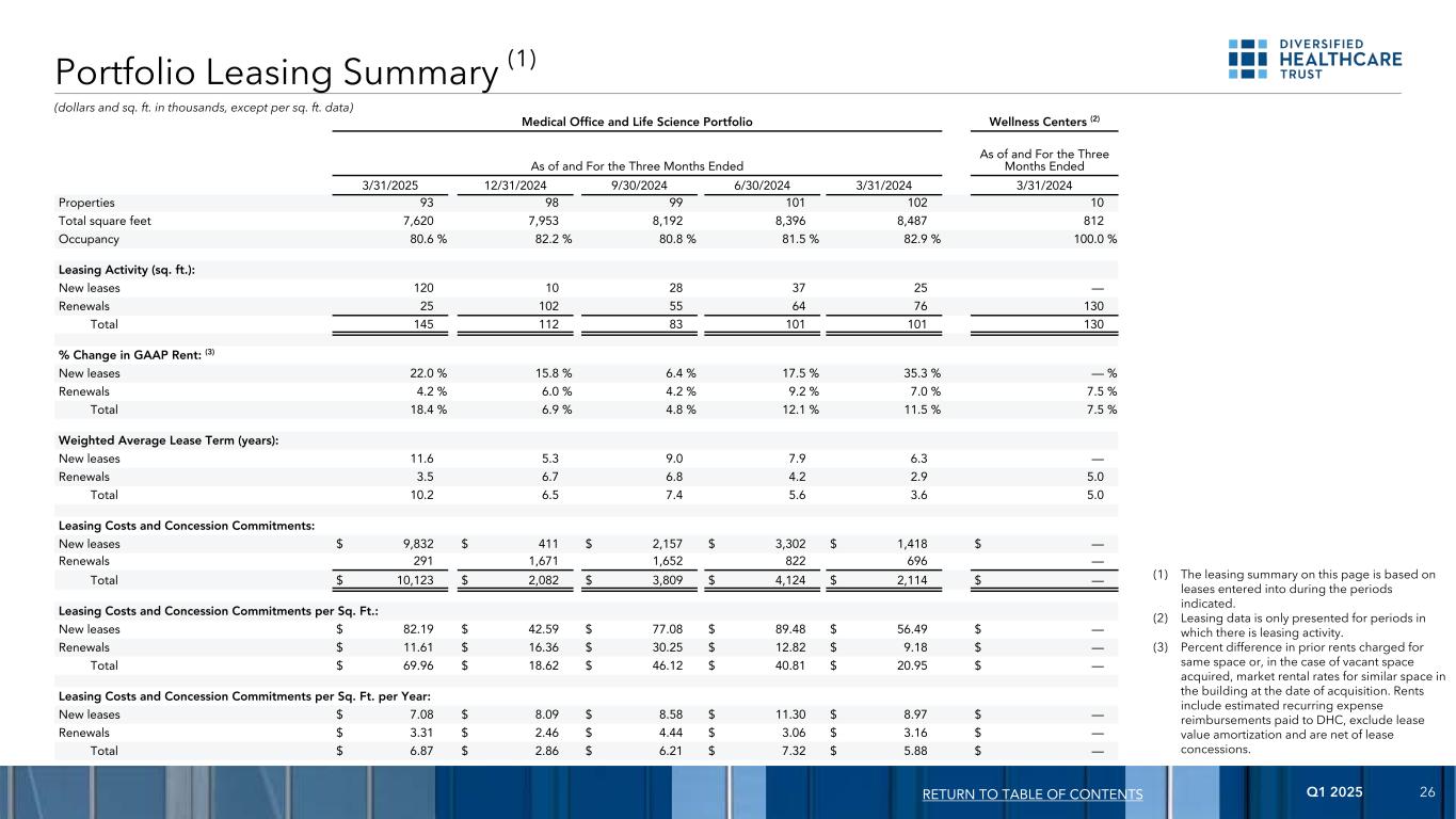 2025年第一季度26组合租赁摘要(1)(1)本页的租赁摘要基于在所示期间订立的租赁。(2)租赁数据仅针对存在租赁活动的期间列报。(3)对相同空间收取的先前租金的差额百分比,或在获得空置空间的情况下,在获得之日建筑物中类似空间的市场租金比率。租金包括支付给DHC的估计经常性费用偿还,不包括租赁价值摊销,并已扣除租赁特许权。返回目录医疗办公室和生命科学组合健康中心(2)截至和截至三个月及截至2025年3月31日止三个月12/31/20249/30/20246/30/20243/31/20243/31/2024物业93989910110210总平方英尺7,6207,9538,1928,3968,487812入住率80.6% 82.2% 80.8% 81.5% 82.9% 100.0%租赁活动(平方英尺):新租约12010283725 —续租25102556476130合计14511283 101101130% GAAP租金变化:(3)新租约22.0% 15.8% 6.4% 17.5% 35.3% —%续租4.2% 6.0% 4.2% 9.2% 7.0% 7.5%合计18.4% 6.9% 4.8% 12.1% 11.5% 7.5%加权平均租赁期限(年):新租赁11.65.39.07.96.3 —续租3.56.86.4.2 2.95.0合计10.26.57.45.6 3.65.0租赁成本和特许权承诺:新租赁$ 9,832 $ 411 $ 2,157 $ 3,302 $ 1,418 $ —续租2911,6711,652822696 —合计$ 10,123 $ 2,082 $ 3,809 $ 4,124 $ 2,114 $ —租赁成本和特许权承诺每平方米。英尺:新租约82.19美元42.59美元77.08美元89.48美元56.49美元——续租11.61美元16.36美元30.25美元12.82美元9.18美元——总计69.96美元18.62美元46.12美元40.81美元20.95美元——每平方米的租赁成本和特许权承诺。每年英尺:新租约$ 7.08 $ 8.09 $ 8.58 $ 11.30 $ 8.97 $ —续租$ 3.31 $ 2.46 $ 4.44 $ 3.06 $ 3.16 $ —总计$ 6.87 $ 2.86 $ 6.21 $ 7.32 $ 5.88 $ —(以千美元和平方英尺计,每平方英尺数据除外)