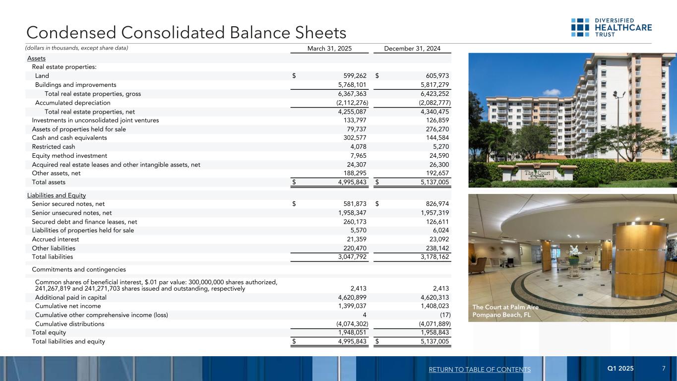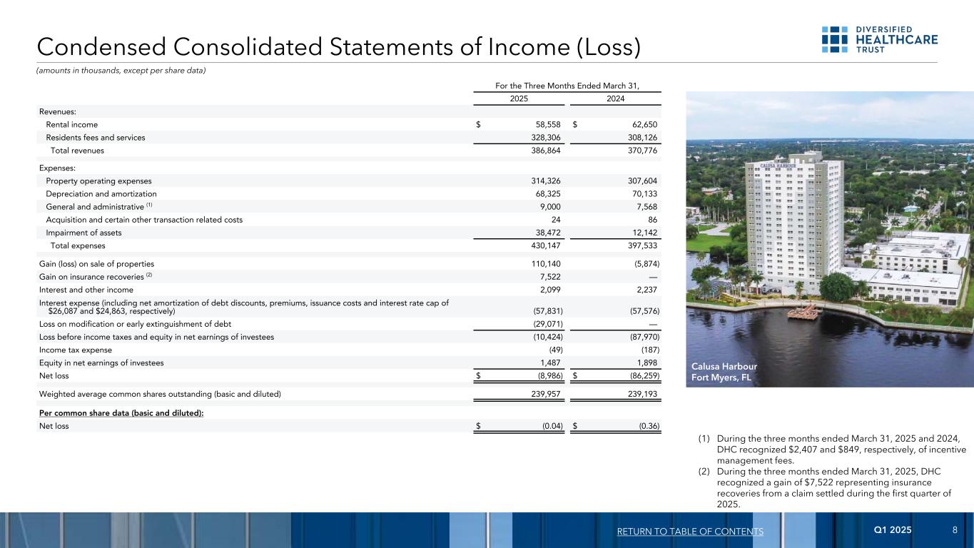 2025年第一季度8截至2025年3月31日止三个月2024年收入:租金收入58,558美元62,650美元居民费用和服务328,306308,126总收入386,864370,776费用:物业运营费用314,326307,604折旧和摊销68,32570,133一般和行政(1)9,0007,568购置和某些其他交易相关成本2486资产减值38,47212,142总费用430,147397,533出售物业收益(损失)110,140(5,874)保险追偿收益(2)7,522 —利息和其他收入2,0992,237利息支出(包括债务贴现、溢价、发行成本和利率上限分别为26,087美元和24,863美元)(57,831)(57,576)债务修改或提前清偿损失(29,071)—所得税前损失和被投资方净收益中的权益(10,424)(87,970)所得税费用(49)(187)被投资方净收益中的权益1,4871,898净亏损$(8,986)$(86,259)加权平均已发行普通股(基本和稀释)239,957239,193每普通股数据(基本和稀释):净亏损$(0.04)$(0.36)简明合并损益表(损益表)返回目录(以千为单位,每股数据除外)(1)在截至2025年3月31日和2024年3月31日的三个月内,DHC分别确认了2407美元和849美元的激励管理费。(2)在截至2025年3月31日的三个月内,DHC确认了7522美元的收益,这是从2025年第一季度期间结算的索赔中获得的保险赔偿。卡卢萨港Fort Myers,FL