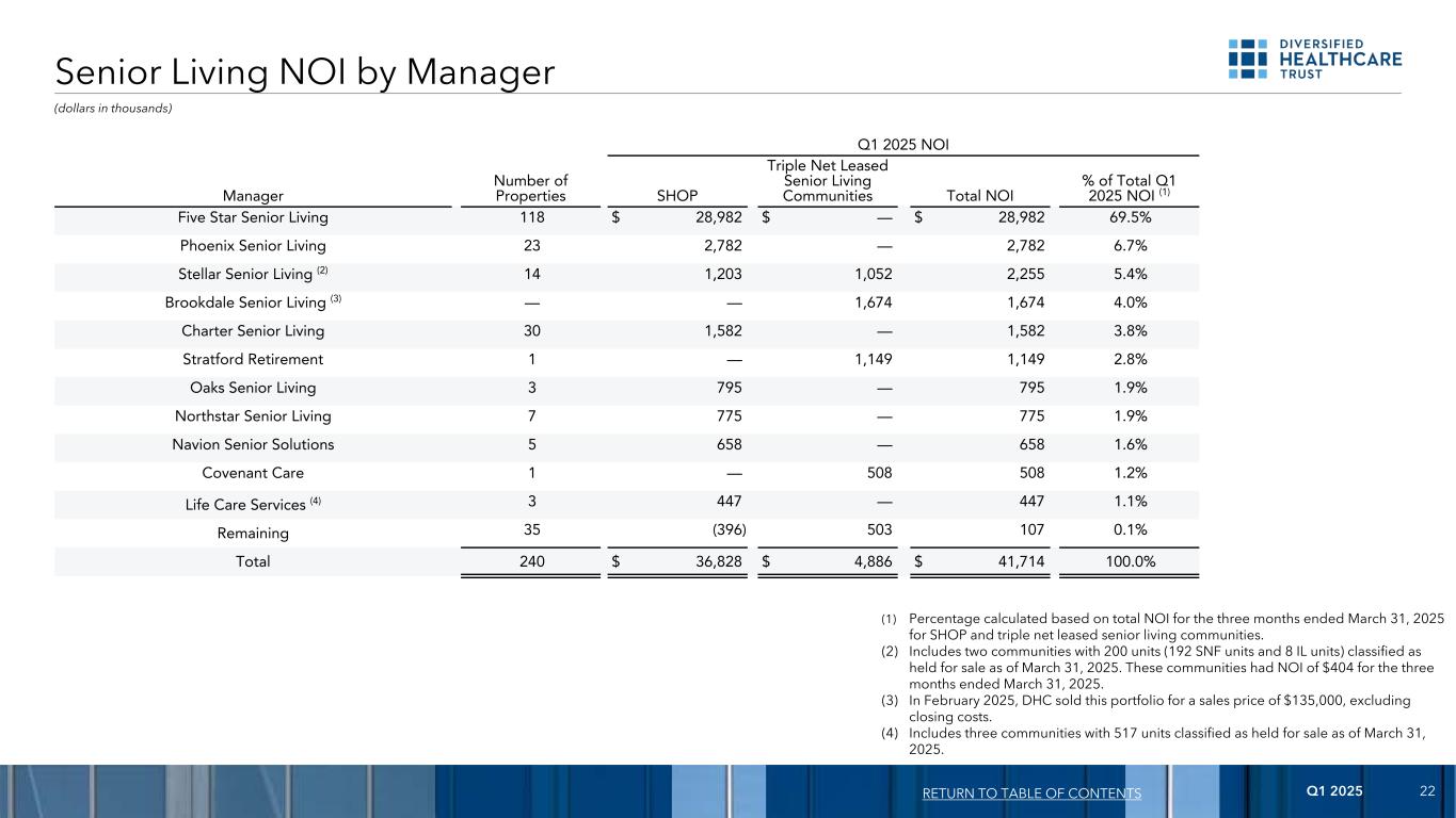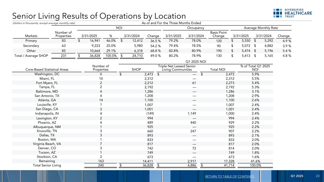 2025年第一季度22按经理划分的老年生活NOI返回目录2025年第一季度NOI经理的物业数量商店三倍净租赁老年生活社区总计NOI占2025年第一季度总NOI的百分比NOI(1)五星老年生活118 $ 28,982 $ — $ 28,98269.5%凤凰老年生活232,782 — 2,7826.7%恒星老年生活(2)141,2031,0522,255.4% 布鲁克代尔高级护理(3)—— 1,6741,6744.0%特许老年生活301,582 — 1,5823.8% Stratford Retirement 1 — 1,1491,1492.8% Oaks Senior Living 3795 — 7951.9% Northstar Senior Living7775 — 7751.9% Navion Senior Solutions 5658 — 6581.6% Covenant Care 1 — 5085081.2% Life Care Services(4)3447 — 4471.1% Remaining 35(396)5031070.1% Total 240 $ 36,828 $ 4,886 $ 41,714100.0%(1)根据SHOP和三重净租赁老年生活社区截至2025年3月31日止三个月的NOI总额计算的百分比。(2)包括截至2025年3月31日分类为持有待售的200个单位(192个SNF单位和8个IL单位)的两个社区。截至2025年3月31日的三个月,这些社区的NOI为404美元。(3)2025年2月,DHC出售了这个投资组合,销售价格为13.5万美元,不包括交易结束费用。(4)包括三个社区,截至2025年3月31日分类为持有待售单位517个。(千美元)