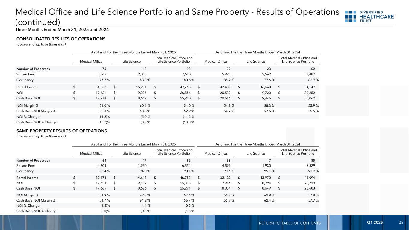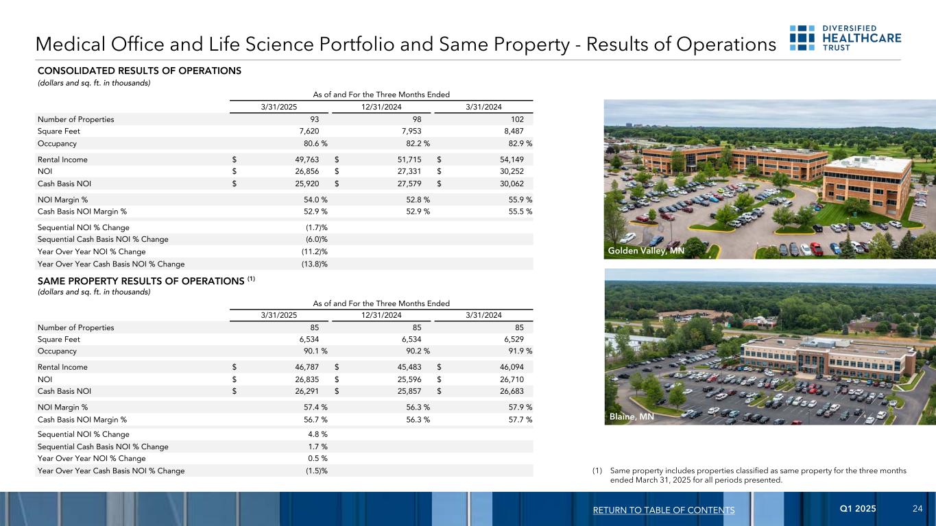 2025年第一季度24(1)同一物业包括截至2025年3月31日止三个月所有呈报期间分类为同一物业的物业。返回目录合并运营结果(美元和平方英尺,单位:千)截至及截至2025年3月31日止三个月12/31/20243/31/2024物业数目9398102平方呎7,6207,9538,487入住率80.6% 82.2% 82.9%租金收入$ 49,763 $ 51,715 $ 54,149 NOI $ 26,856 $ 27,331 $ 30,252现金基础NOI $ 25,920 $ 27,579 $ 30,062 NOI Margin % 54.0% 52.9% 55.5%现金基础NOI Margin % 52.9% 52.9% 55.5%连续现金基础NOI %变化(1.7)%连续现金基础NOI %变化(6.0)%同比NOI %变化(11.2)%同比现金基础NOI %变动(13.8)%经营活动的相同财产结果(1)(美元和平方英尺,单位:千)截至及截至2025年3月31日止三个月12/31/20243/31/2024物业数目858585平方呎6,5346,5346,529入住率90.1% 90.2% 91.9%租金收入$ 46,787 $ 45,483 $ 46,094 NOI $ 26,835 $ 25,596 $ 26,710现金基础NOI $ 26,291 $ 25,857 $ 26,683 NOI Margin % 57.4% 56.3% 57.9% Cash Basis NOI Margin % 56.7% 56.3% 57.7% Sequential NOI % change 4.8% Sequential cash basis NOI % change 1.7% year-on-year NOI % change 0.5% year-on-year cash basis NOI %变动(1.5)%医疗办公室和生命科学投资组合和相同资产-运营结果Valencia,加利福尼亚州 Golden Valley,MN Blaine,MN