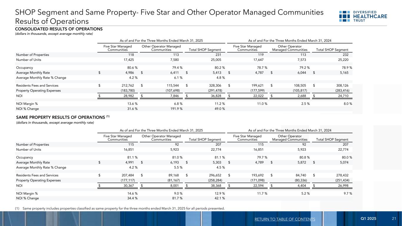 2025年第一季度21日截至2025年3月31日止三个月及截至3月31日止三个月的目录报表,2024年五星管理社区其他运营商管理社区总店铺段五星管理社区其他运营商管理社区总店铺段物业数量1181132311119113232单位数17,4257,58025,00517,6477,57325,220入住80.6% 79.4% 80.2% 78.7% 79.2% 78.9%平均月费率$ 4,986 $ 6,411 $ 5,413 $ 4,787 $ 6,044 $ 5,165平均月率%变化4.2% 6.1% 4.8%居民费用和服务$ 212,762 $ 115,544 $ 328,306 $ 199,621 $ 108,505 $ 308,126物业运营费用(183,780)(107,698)(291,478)(177,599)(105,817)(283,416)NOI $ 28,982 $ 7,846 $ 36,828 $ 22,022 $ 2,688 $ 24,710 NOI Margin % 13.6% 6.8% 11.2% 11.0% 2.5% 8.0% NOI % change 31.6% 191.9% 49.0% Same property results of operations(1)(dollars in thousand,except average monthly rate)截至2025年3月31日止三个月截至3月31日止三个月,2024年五星管理社区其他运营商管理社区总店铺段五星管理社区其他运营商管理社区总店铺段物业数量1159220711592207单位数16,8515,92322,77416,8515,92322,77416,92322,774入住率81.1% 81.0% 81.1% 79.7% 80.8% 80.0%平均月费率$ 4,991 $ 6,193 $ 5,303 $ 4,789 $ 5,872 $ 5,074平均月率%变化4.2% 5.5% 4.5%居民费和服务$ 207,484 $ 89,168 $ 296,652 $ 193,692 $ 84,740 $ 278,432物业运营费用(177,117)(81,167)(258,284)(171,098)(80,336)(251,434)NOI $ 30,367 $ 8,001 $ 38,368 $ 22,594 $ 4,404 $ 26,998 NOI Margin % 14.6% 9.0% 12.9% 11.7% 5.2% 9.7% NOI % change 34.4% 81.7% 42.1% SHOP segment and Same Property-Five Star and Other Operator Managed Communities Results Consolidated Results of Operations(dollars in thousand,平均月费率除外)(1)同一物业包括截至2025年3月31日止三个月的所有呈报期间分类为同一物业的物业。