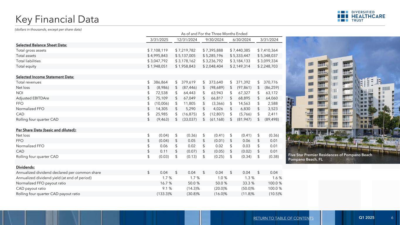 2025年第一季度52025年第一季度业绩截至三个月财务业绩目录报表报表2025年3月31日2024年12月31日变动百分比3月31日,2024%变动净亏损$(8,986)$(87,446)89.7% $(86,259)89.6%每股净亏损$(0.04)$(0.36)88.9% $(0.36)88.9%正常化FFO $ 14,305 $ 5,290170.4% $ 3,523306.0%每股正常化FFO $ 0.06 $ 0.02 200.0% $ 0.01 500.0%调整后EBITDA $ 75,109 $ 67,04912.0% $ 64,06017.2%截至2025年3月31日止三个月2024年12月31日基点变动3月31日,2024年基点变动入住率商店80.2% 80.0% 2078.9% 130医疗办公和生命科学组合80.6% 82.2%(160)82.9%(230)相同物业入住率商店81.1% 81.2%(10)80.0% 110医疗办公和生命科学组合90.1% 90.2%(10)91.9%(180)(以千美元计,每股数据除外)