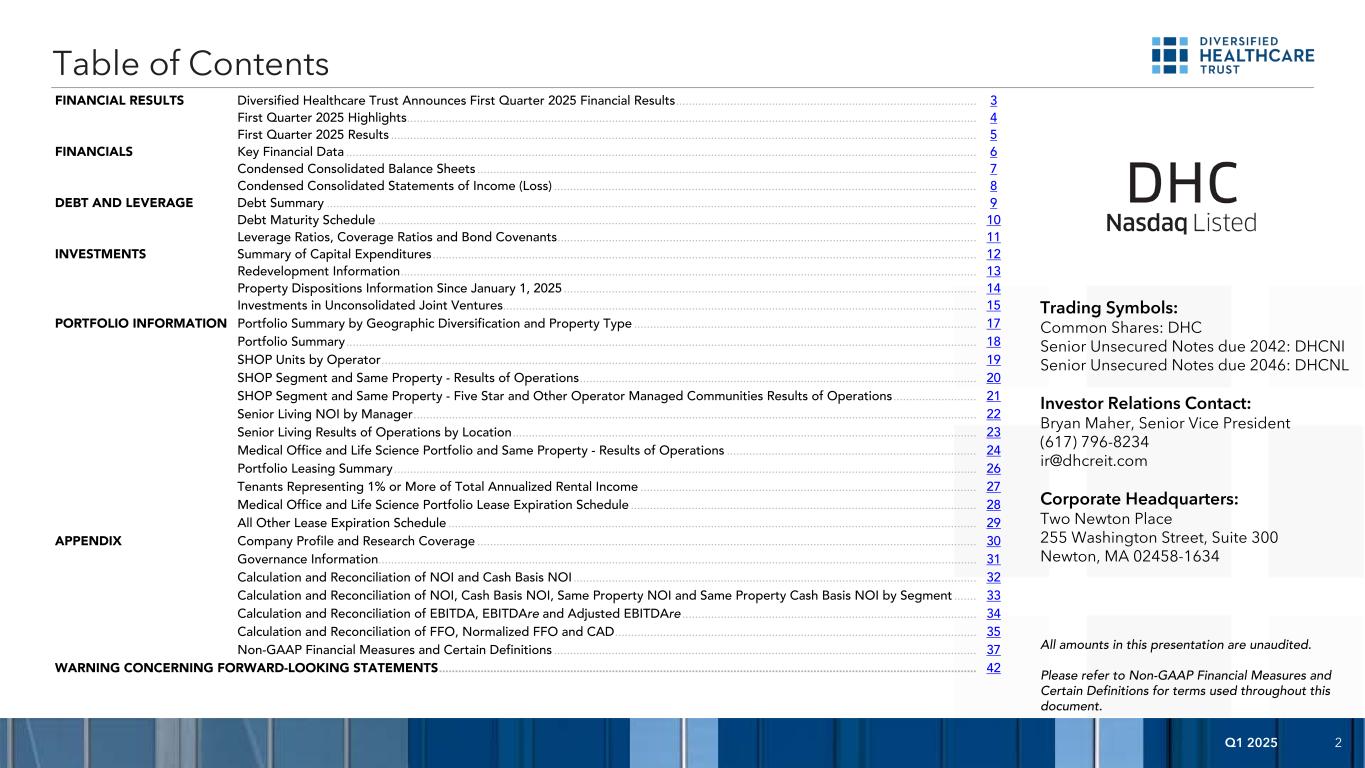 2025年第一季度2财务业绩Diversified Healthcare Trust公布2025年第一季度财务业绩......................................................................................................................3 2025年第一季度亮点.......................................................................................................................................................4 2025年第一季度业绩....................................................................................................................................................5财务关键财务数据....................................................................................................................................................................................6简明合并资产负债表....................................................................................................................7简明合并收益表(亏损)....................................................................................8债务和杠杆债务摘要....................................................................................................................................9债务到期时间表.......................................................................................................................................................10杠杆率、覆盖率和债券契约表......................................................................................12重建资料......................................................................................................................................................1月1日以来的13项物业处置资料, 2025年......................................................................................................14对未合并的合资企业的投资.......................................................................................................................................15按地域多元化和物业类型分列的投资组合信息投资组合摘要.......................................................................................................................................................17投资组合摘要....................................................................................................................................................................18个按运营商划分的店铺单元....................................................................................................................................................................19个店铺分部和相同物业-运营结果.......................................................................................20个店铺分部和相同物业-五星及其他运营商管理社区运营结果....................................................21按经理划分的老年生活NOI.......................................................................................................................................................................22按地区划分的老年生活运营结果................................................................................................................................................................23医疗办公和生活和同一物业-经营业绩......................................................................................24组合租赁摘要......................................................................................................................................................27医疗办公室和生命科学组合租赁到期时间表.......................................................................................28所有其他租赁到期时间表....................................................................................................................................29附录公司简介和研究覆盖范围....................................................................................................................................30治理信息.......................................................................................................................................................................31 NOI和现金基础NOI的计算和调节....................................................................................................32 NOI、现金基础NOI、相同财产NOI和相同财产现金基础NOI按分部的计算和调节.....。EBITDA和调整后EBITDA......................................................................................34 FFO、正常化FFO和CAD的计算和调节.......................................................................................................................35非公认会计准则财务措施和某些定义....................................................................................................................................37关于前瞻性陈述的警告....................................................................................................................................................42目录本列报中的所有金额均未经审计。请参阅非GAAP财务指标和某些定义,了解本文件通篇使用的术语。交易代码:普通股:2042年到期的DHC高级无抵押票据:2046年到期的DHCNI高级无抵押票据:DHCNL投资者关系联系人:Bryan Maher,高级副总裁(617)796-8234 ir@dhcreit.com公司总部:Two Newton Place 255 Washington Street,Suite 300 Newton,MA 02458-1634