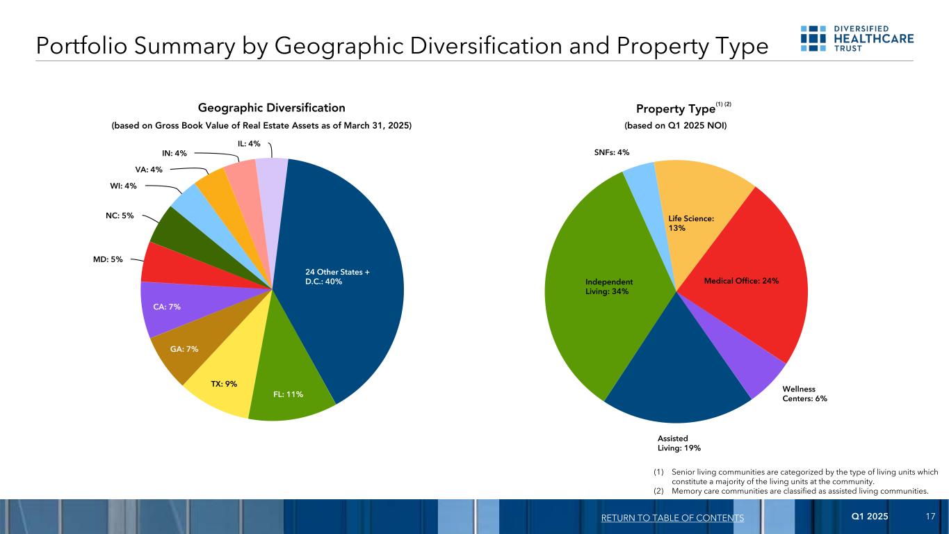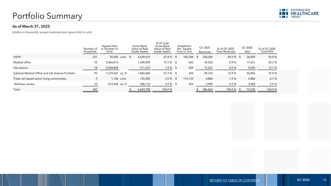 2025年第一季度17 FL:11% TX:9% GA:7% 加利福尼亚州:7% MD:5% NC:5% WI:4% VA:4% IN:4% IL:4% 24其他州+ DC:40%(基于截至2025年3月31日的房地产资产账面总值)(1)老年生活社区按构成社区大部分生活单元的生活单元类型分类。(二)记忆关怀社区划为辅助生活社区。按地理多元化和物业类型划分的投资组合摘要地理多元化回归目录辅助生活医疗:19%独立生活:34% SNFs:4%生命科学:13%医疗办公室:24%健康中心:6%物业类型(1)(2)(基于2025年第一季度NOI)