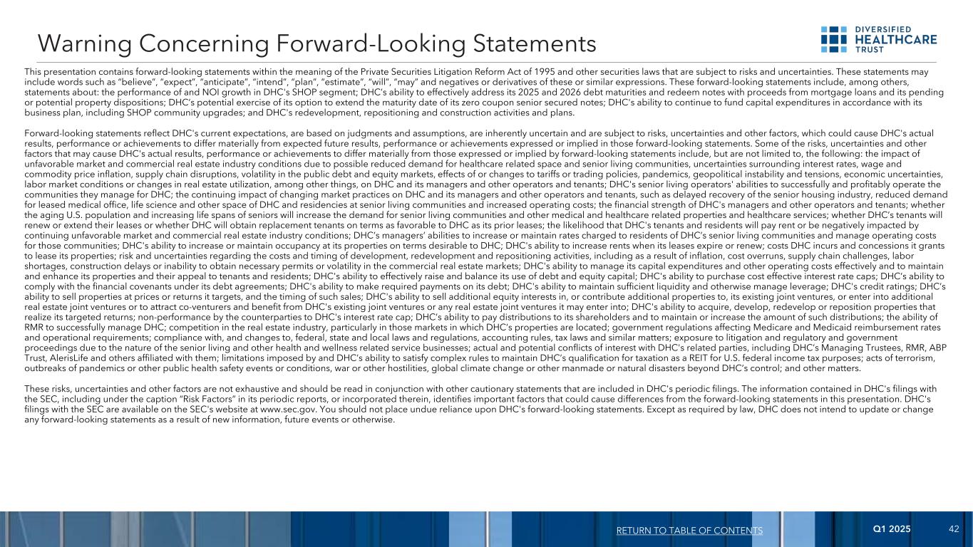 2025年第一季度42本演示文稿包含1995年《私人证券诉讼改革法案》和其他受风险和不确定性影响的证券法含义内的前瞻性陈述。这些陈述可能包括“相信”、“预期”、“预期”、“打算”、“计划”、“估计”、“将”、“可能”等词语,以及这些或类似表述的否定或衍生。除其他外,这些前瞻性陈述包括:DHC SHOP部门的业绩和NOI增长;DHC有效应对2025年和2026年债务到期的能力,并利用抵押贷款及其未决或潜在财产处置的收益赎回票据;DHC潜在行使延长其零息优先有担保票据到期日的选择权;DHC根据其业务计划(包括SHOP社区升级)继续为资本支出提供资金的能力;以及DHC的重建、重新定位和建设活动和计划。前瞻性陈述反映了DHC当前的预期,是基于判断和假设的,具有内在的不确定性,并受到风险、不确定性和其他因素的影响,这可能导致DHC的实际结果、业绩或成就与这些前瞻性陈述中明示或暗示的预期未来结果、业绩或成就存在重大差异。可能导致DHC的实际结果、业绩或成就与前瞻性陈述中明示或暗示的存在重大差异的一些风险、不确定性和其他因素包括但不限于:由于对医疗保健相关空间和老年生活社区的需求可能减少而产生的不利市场和商业房地产行业条件的影响、围绕利率的不确定性、工资和商品价格通胀、供应链中断、公共债务和股票市场的波动、关税或贸易政策的影响或变化、流行病、地缘政治不稳定和紧张局势、经济不确定性,劳动力市场条件或房地产利用率的变化,其中包括,对DHC及其管理者以及其他经营者和租户的影响;DHC高级生活经营者成功且有利可图地为DHC运营其管理的社区的能力;不断变化的市场做法对DHC及其管理者以及其他经营者和租户的持续影响,例如老年住房行业的延迟复苏,减少了对租赁医疗办公室的需求,DHC的生命科学和其他空间以及老年生活社区的住所以及增加的运营成本;DHC的管理者和其他运营商及租户的资金实力;美国人口老龄化和老年人寿命的延长是否会增加对老年生活社区及其他医疗保健相关物业和医疗保健服务的需求;DHC的租户是否会续签或延长租约,或者DHC是否会按照与其先前租约一样对DHC有利的条款获得替换租户;可能性DHC的租户和居民将支付租金,或受到持续不利的市场和商业房地产行业状况的负面影响;DHC的管理者提高或维持向DHC的老年生活社区居民收取的费率以及管理这些社区的运营成本的能力;DHC按照DHC所希望的条款增加或维持其物业的入住率的能力;DHC在租约到期或续签时提高租金的能力;DHC产生的成本以及授予租赁其物业的特许权;开发、再开发和重新定位活动的成本和时间安排方面的风险和不确定性,包括通货膨胀、成本超支、供应链挑战、劳动力短缺,建设延误或无法获得必要的许可或商业房地产市场波动;DHC有效管理其资本支出和其他运营成本以及维护和增强其物业及其对租户和居民的吸引力的能力;DHC有效筹集和平衡其债务和股权资本使用的能力;DHC购买成本有效利率上限的能力;DHC遵守其债务协议项下财务契约的能力;DHC对其债务进行所需付款的能力;DHC保持充足流动性的能力以及以其他方式管理杠杆;DHC的信用评级;DHC以其目标价格出售物业或向其回报的能力,以及此类出售的时机;DHC出售其现有合营企业的额外股权或向其贡献额外物业的能力,或订立额外的房地产合营企业或吸引合营企业并从DHC现有合营企业或其可能订立的任何房地产合营企业中获益的能力;DHC收购、开发、 重新开发或重新定位实现其目标回报的物业;交易对手不履行DHC的利率上限;DHC向其股东支付分配以及维持或增加此类分配金额的能力;RMR成功管理DHC的能力;房地产行业的竞争,特别是DHC物业所在市场的竞争;影响Medicare和Medicaid报销率和运营要求的政府法规;联邦、州和地方法律法规、会计规则的遵守情况和变更情况,税法及类似事项;由于老年生活和其他健康和保健相关服务业务的性质而面临诉讼以及监管和政府诉讼的风险;与DHC的关联方存在实际和潜在的利益冲突,包括DHC的管理受托人、RMR、ABP Trust、AlerisLife和其他与其有关联的人;以及DHC满足复杂规则以维持DHC作为美国联邦所得税目的的REIT征税资格的能力施加的限制,以及TERM4的能力;恐怖主义行为、流行病的爆发或其他公共卫生安全事件或情况、战争或其他敌对行动,全球气候变化或DHC无法控制的其他人为或自然灾害;以及其他事项。这些风险、不确定性和其他因素并不是详尽无遗的,应与DHC定期申报中包含的其他警示性声明一起阅读。DHC向SEC提交的文件中包含的信息,包括其定期报告中“风险因素”标题下的信息,或其中包含的信息,确定了可能导致与本演示文稿中的前瞻性陈述有所不同的重要因素。DHC向SEC提交的文件可在SEC网站www.sec.gov上查阅。您不应过分依赖DHC的前瞻性陈述。除法律要求外,DHC不打算因新信息、未来事件或其他原因而更新或更改任何前瞻性陈述。关于前瞻性陈述返回目录的警告
